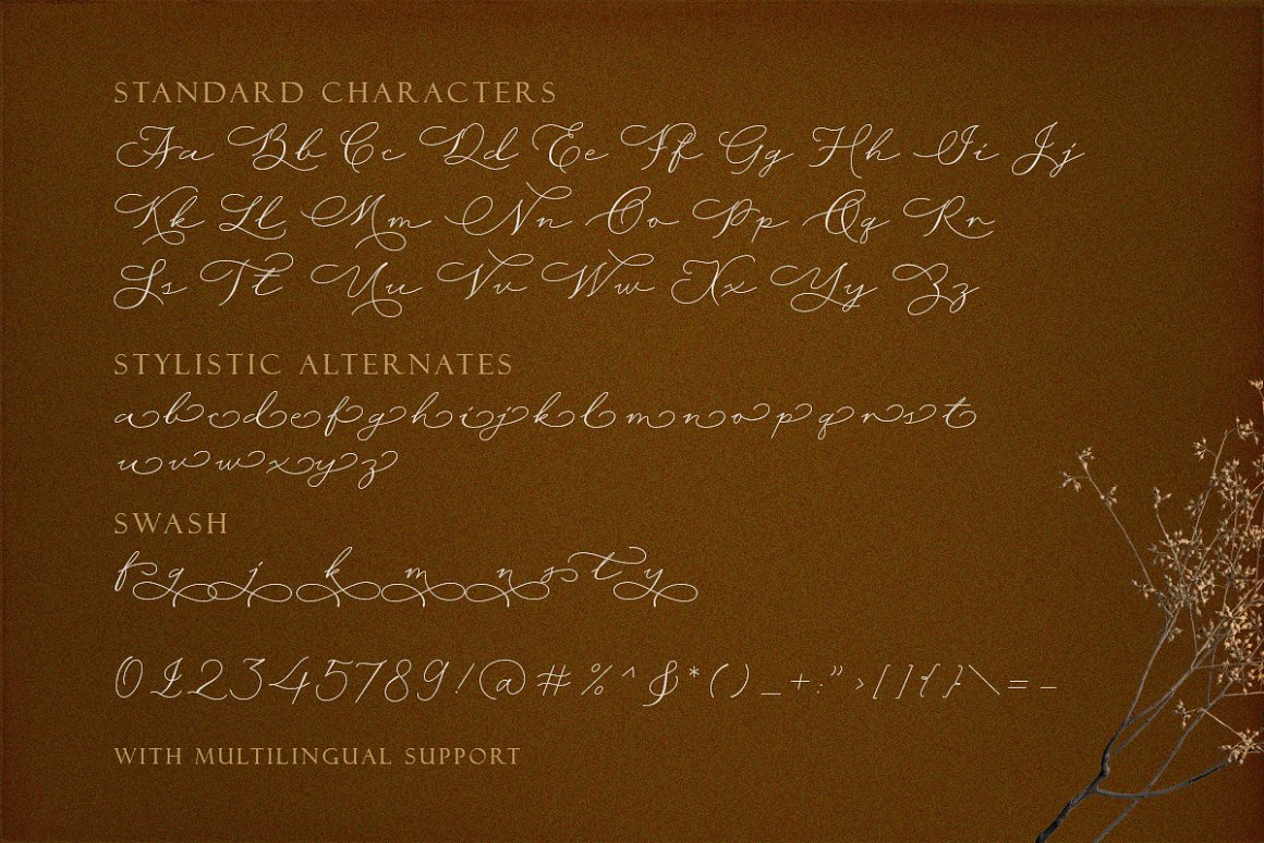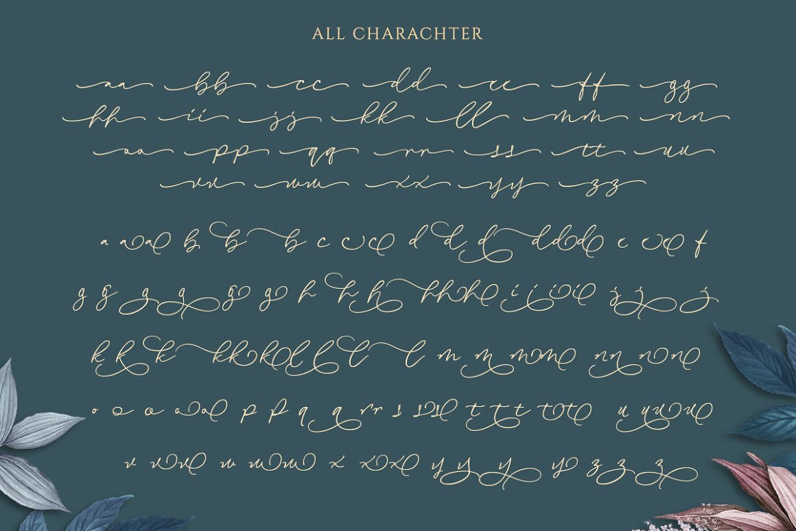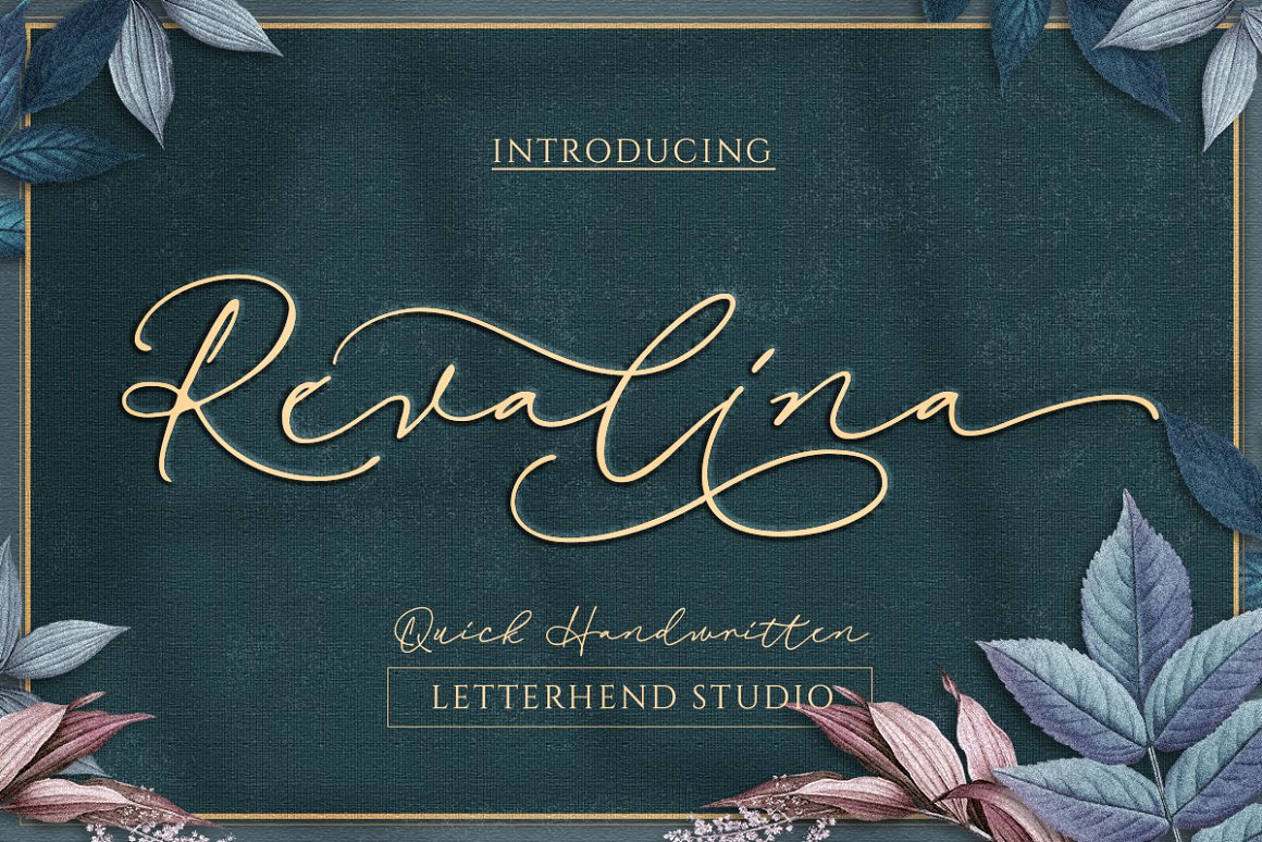 Introducing, Revalina Signature Script – a typeface inspired by natural hand written. This font has many stylistic alternates, ligatures, swashes so you can play around with them using opentype features and creates lettering with natural touch. This type of font perfectly made to be applied especially in logo, and the other various formal forms such as invitations, labels, logos, magazines, books, greeting / wedding cards, packaging, fashion, make up, stationery, novels, labels or any type of advertising purpose.