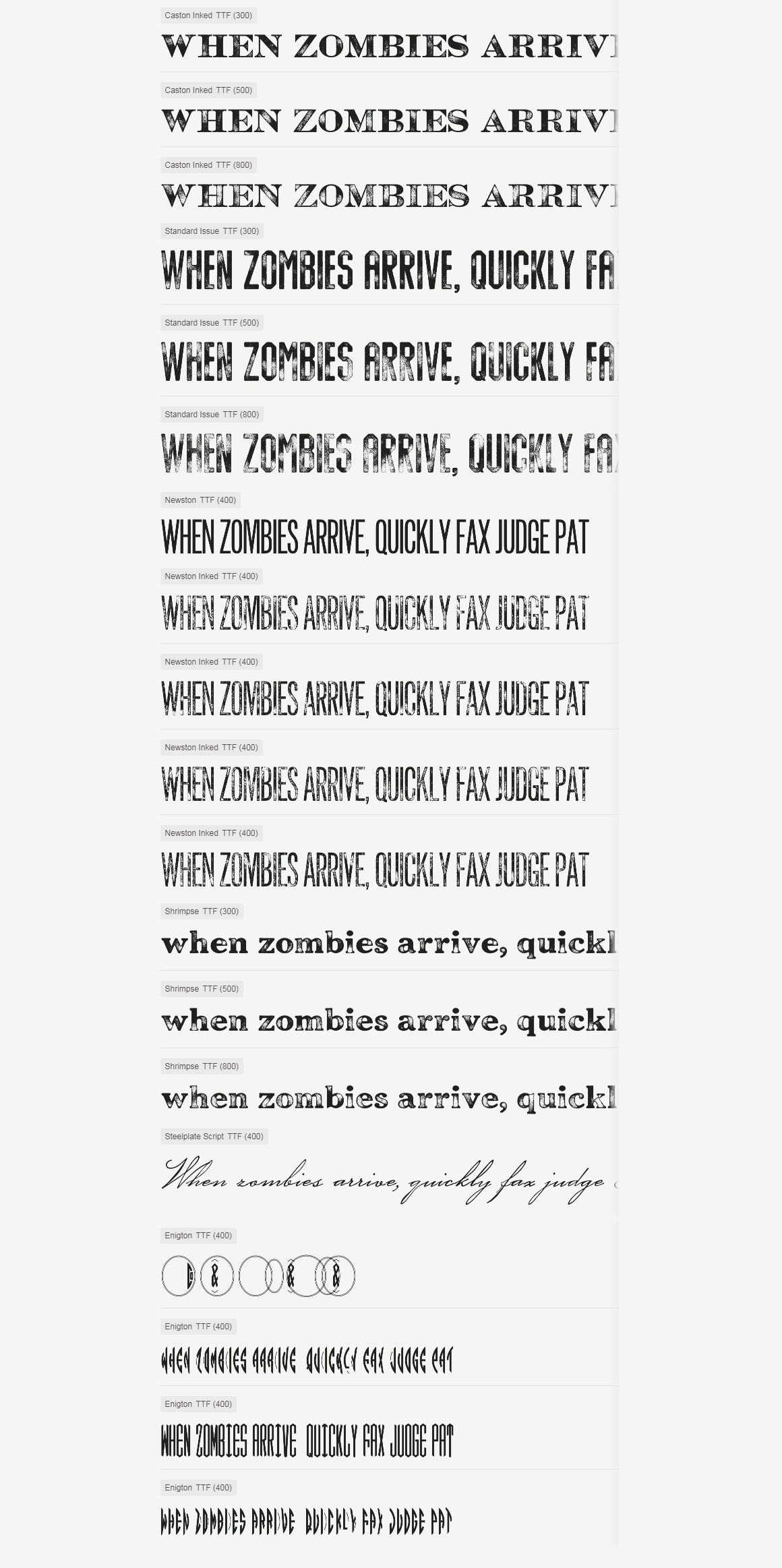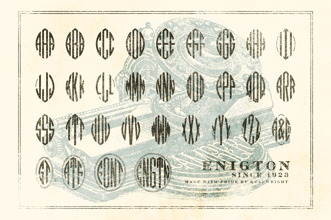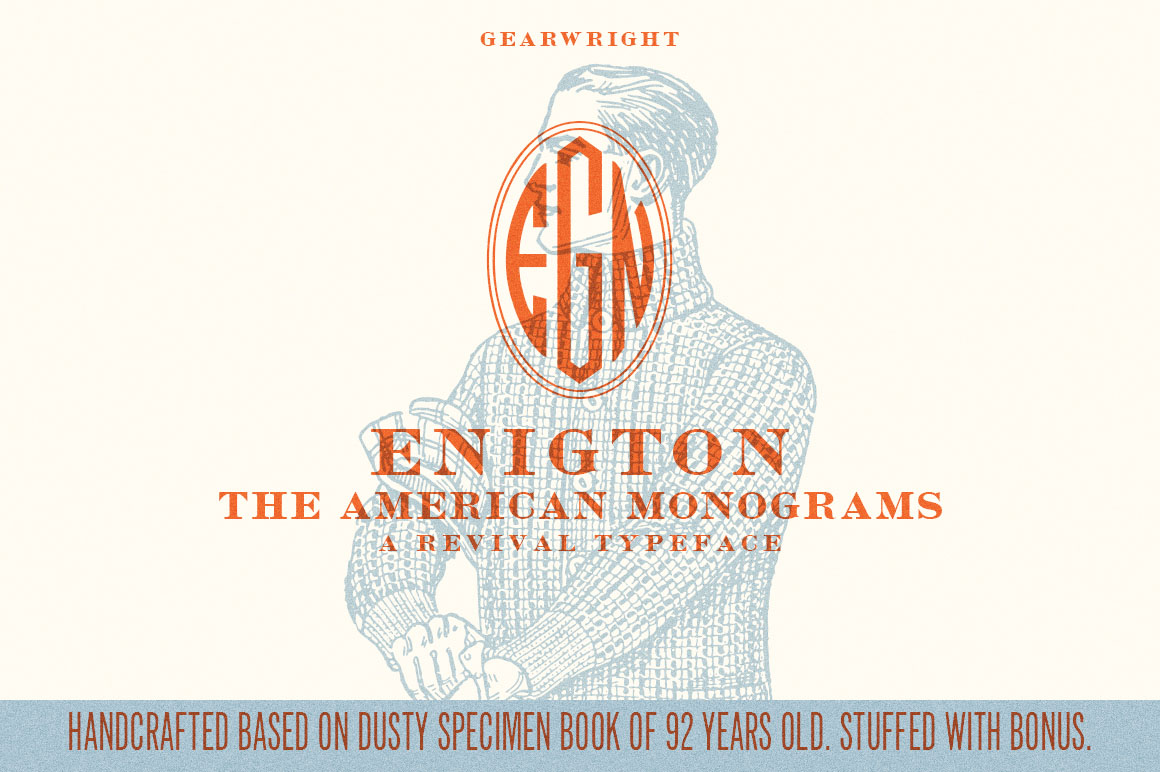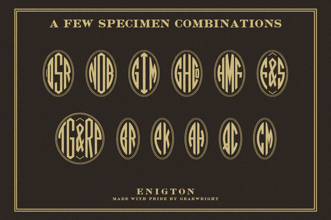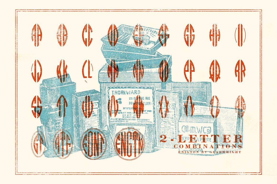 Enigton is a revival monogram typeface based on virkotype combination monograms issued by the American Type Founders in 1920’s. Once dominated the printing industry, the typeface is now in the hands of public domain due to the defunct of ATF decade ago & lacking of active descendants. I own one of the 60,000 copies – the ATF specimen book published in 1923. As I was fascinated by it, Enigton is the 3rd typeface I’ve revived. Enigton is an elegant monogram typeface that reflects vintage modernity and the spirit of honest business printing in 1923. Use Enigton in your projects – it’ll subtly imprint and succeed the good old authenticity of the golden time in american printing industry.