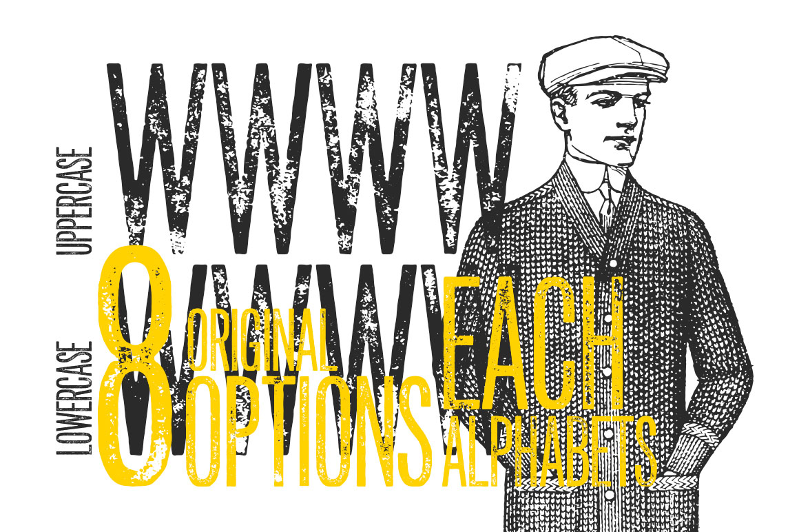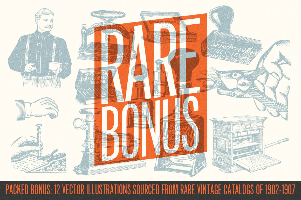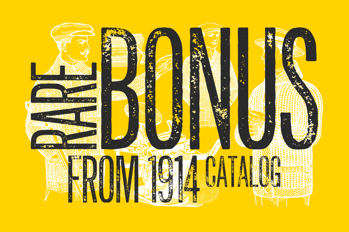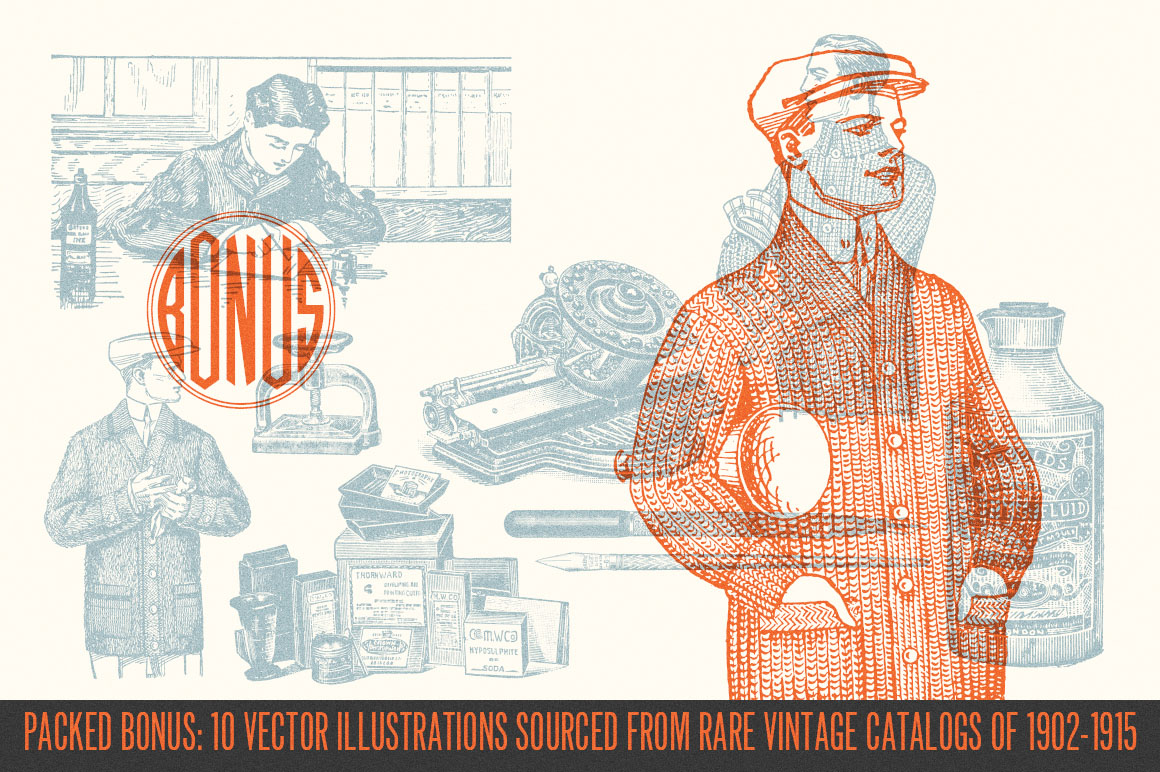 - You’ll also find a pack of 10 vintage illustrations (see preview #5) in AI vector & high resolution PNG. I packed them in as bonus to the font. These illustrations were scanned and optimized from my personal collection of vintage catalogs back in early 1910’s.
