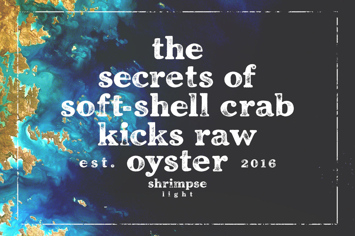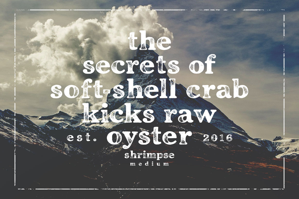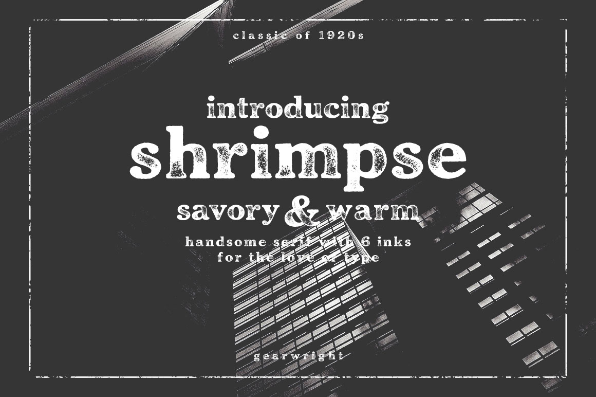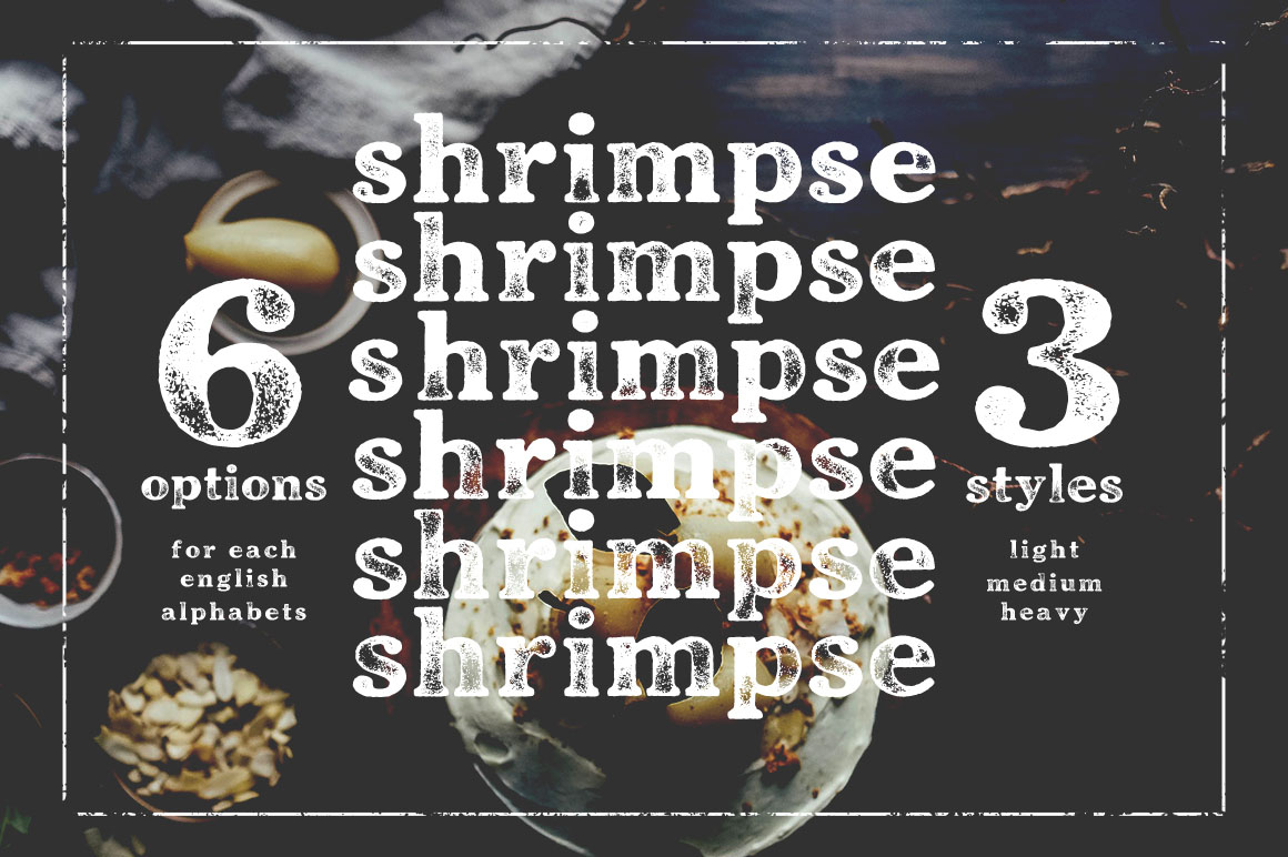 Shrimpse is a tasty display serif made to express ideas with its savory forms and ink texture. Made based on the classic Cheltenham real print from 1920s, once known to be the king of display faces – Shrimpse does extremely well in displaying and advertising as the title face. With Shrimpse you can access to different inked letters easily. The texture is highly detailed – check out the high resolution preview to see how good looking and easy it is to use the font.
