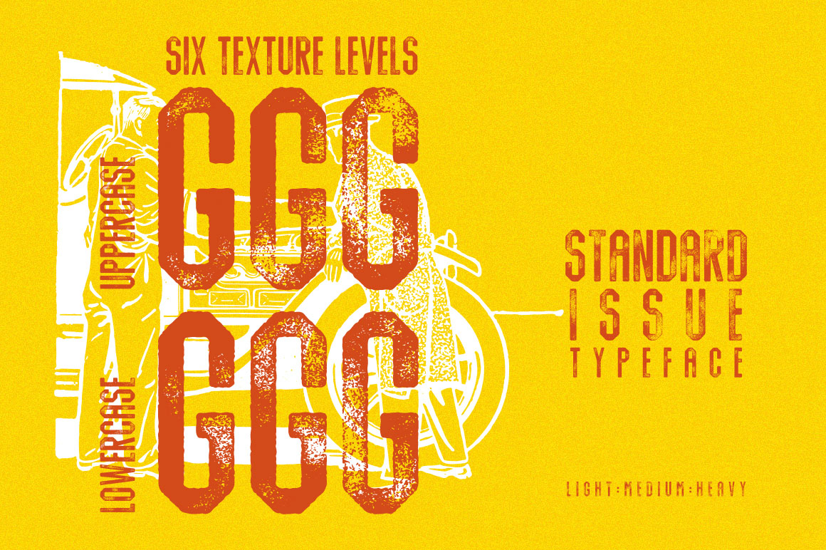 Standard Issue is a full cap typeface, consists of 3 styles – light, medium, and heavy. It allows you to utilize different level of ink texture pattern at ease. Uppercase and lowercase are the same alphabets but inked differently, in total each alphabets has 6 options, see final preview. You will not find the same texture pattern reoccurring in the font.