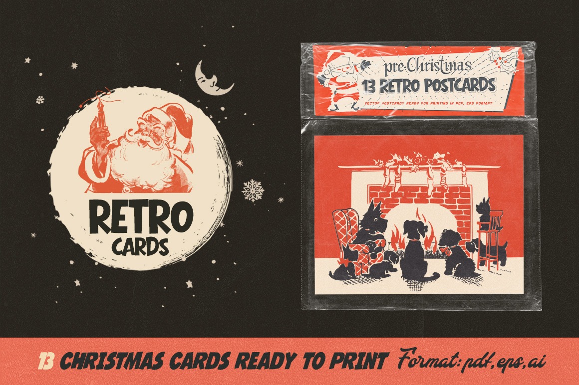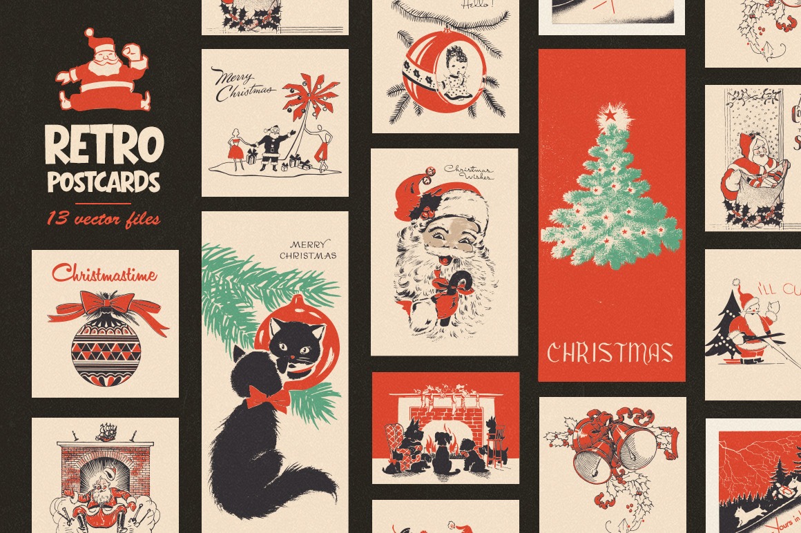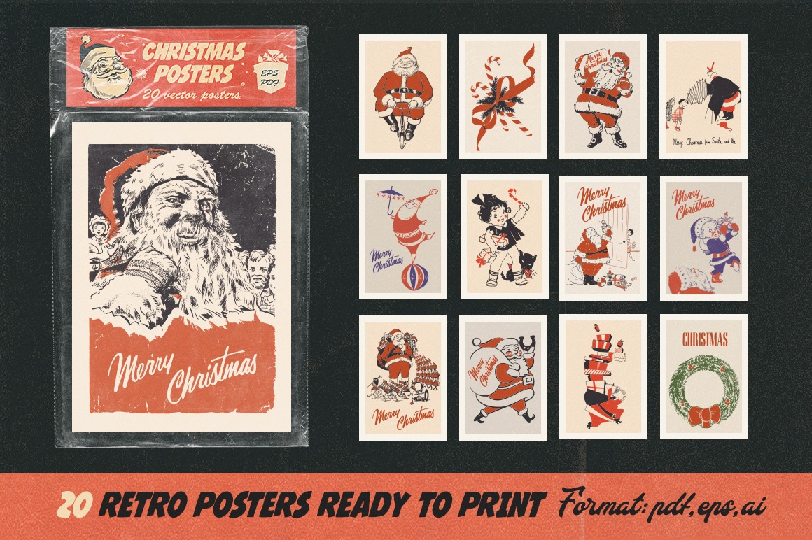 - 13 Christmas card templates, 20 Christmas posters, 10 retro Christmas stickers, 15 vintage Christmas logos