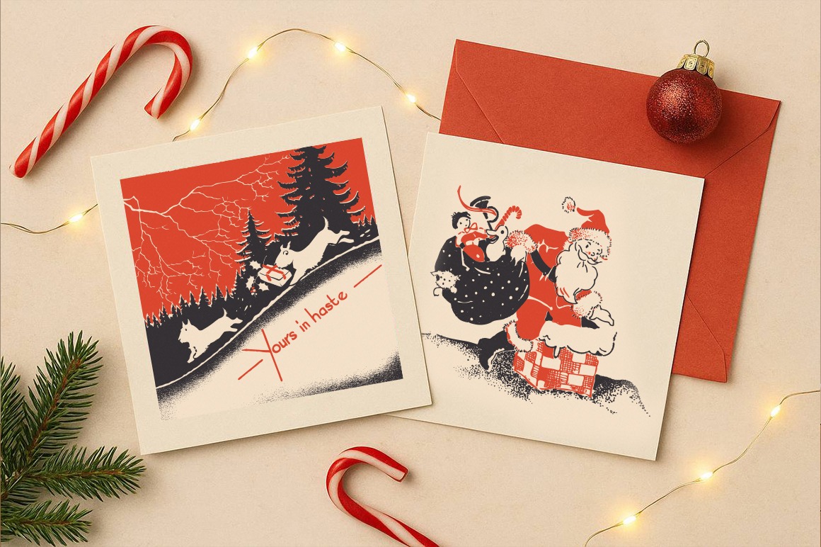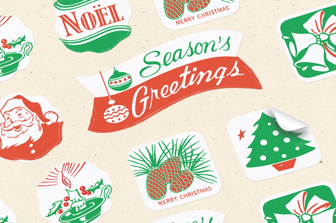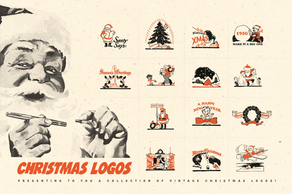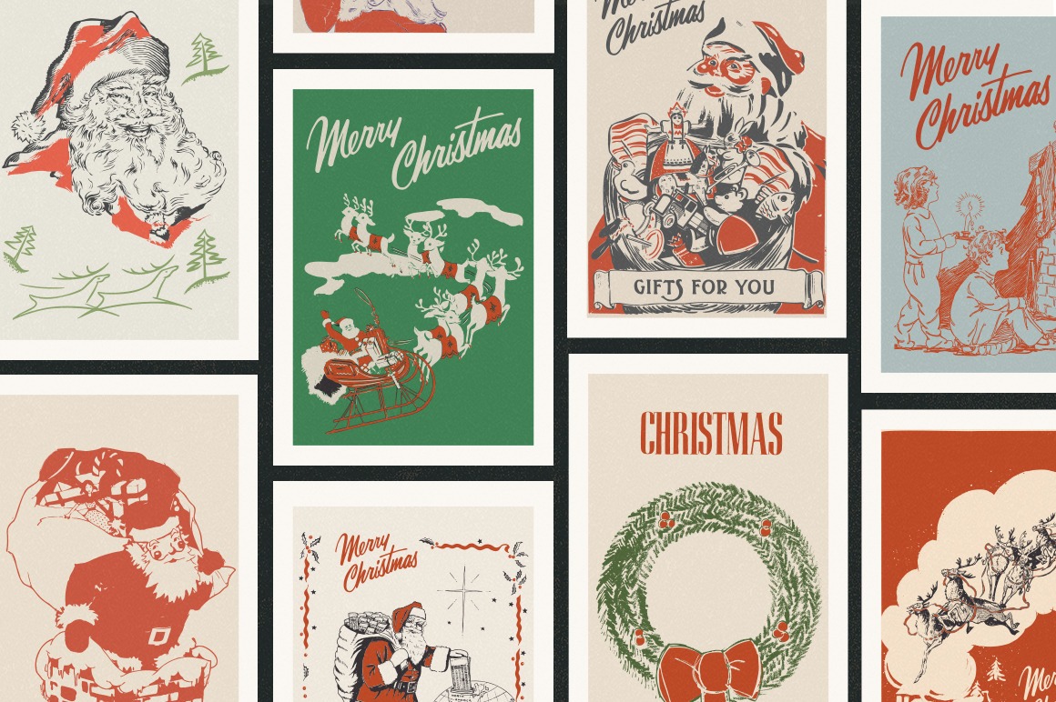 - 13 Christmas card templates, 20 Christmas posters, 10 retro Christmas stickers, 15 vintage Christmas logos