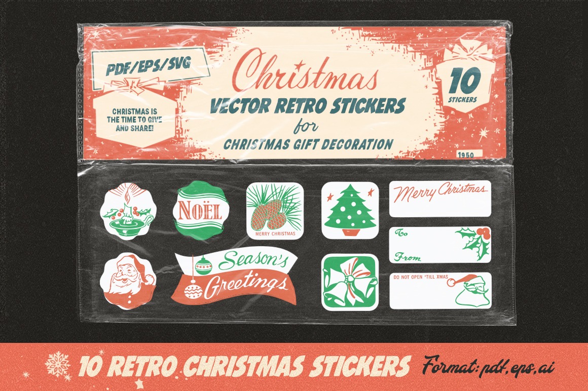 - 10 retro Christmas stickers (AI, EPS, PDF) – great for gift tags, labels, and creative packaging
