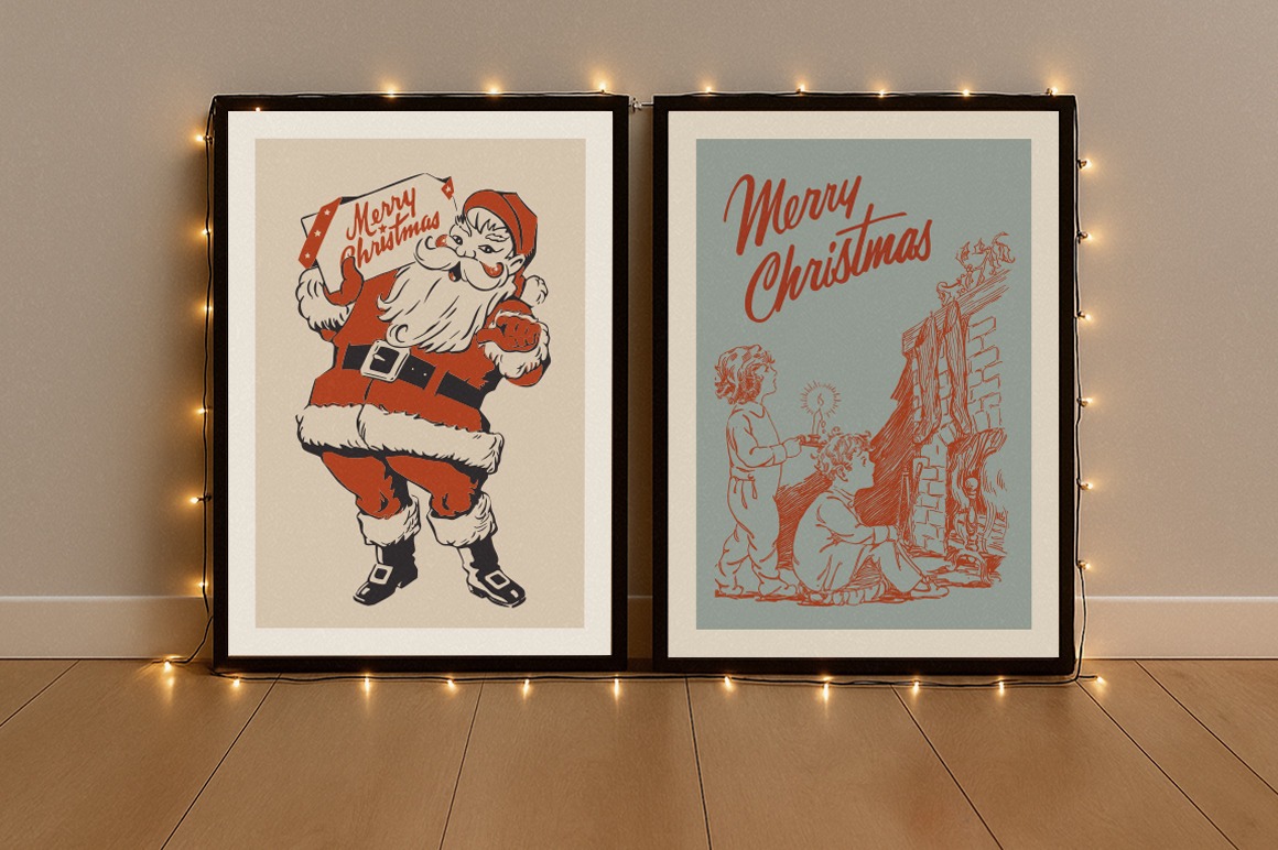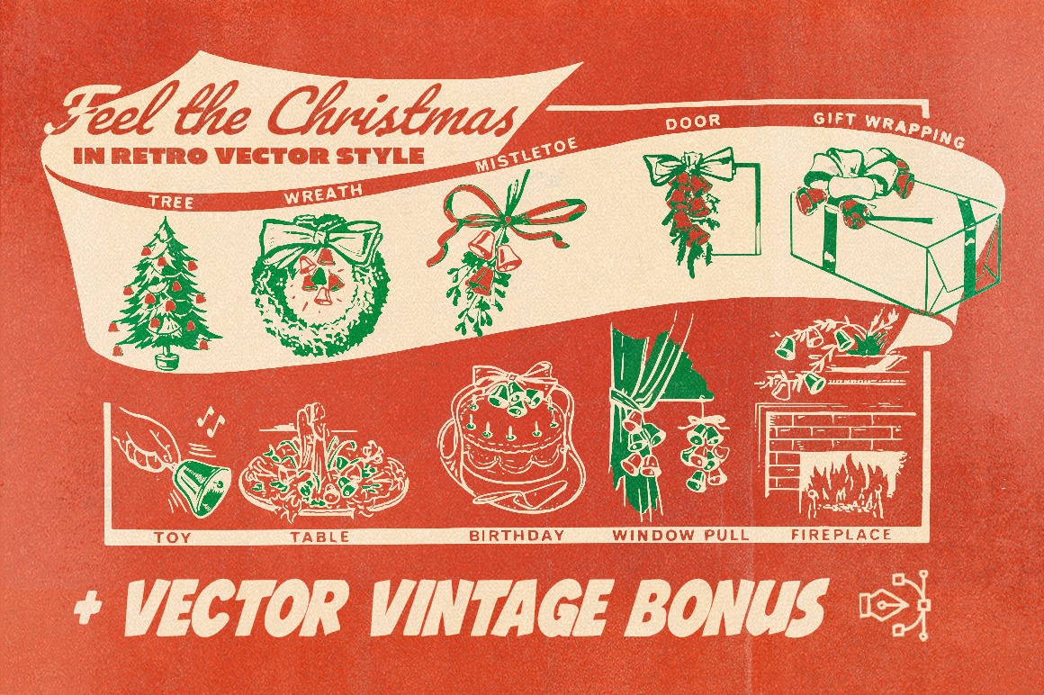 - Bonus: vector Christmas illustrations (AI, EPS, PDF, SVG) – to add extra retro charm and authentic festive mood