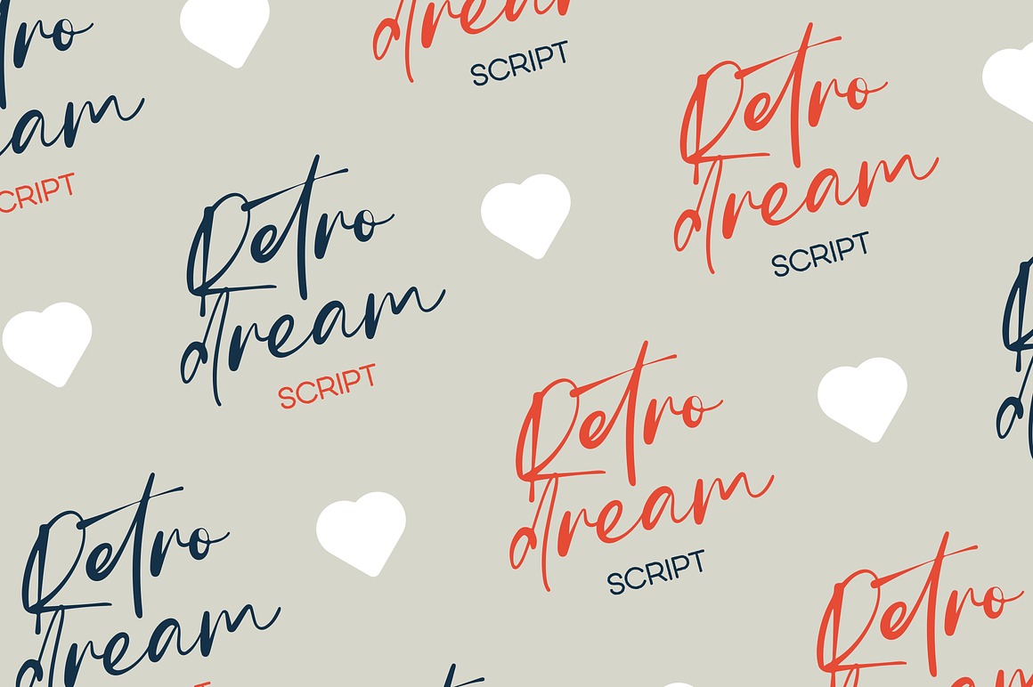 The script variant adds a personal touch with its fluidity, while the sans rough offers a more raw, unrefined edge. Beyond these, Retro Dream surprises with 26 whimsical characters, 26 decorative ribbons, and 26 random elements, each adding a dash of whimsy and creative flair. This typeface collection is perfect for projects that require a blend of the past and present, delivering a vast spectrum of stylistic options.