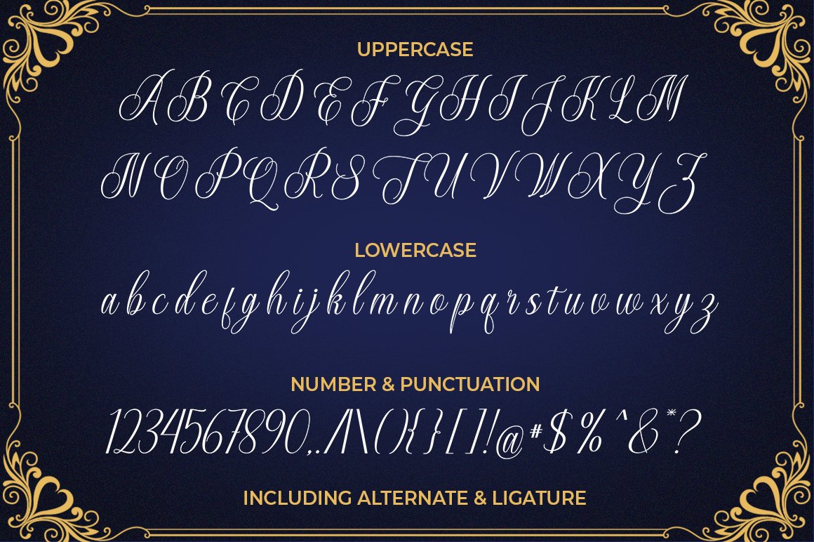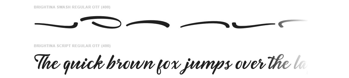 Brightina Script is equipped with: Uppercase, lowercase letters, numbers, punctuation & symbols, Multilingual support, Alternative style, Swash, Ligature