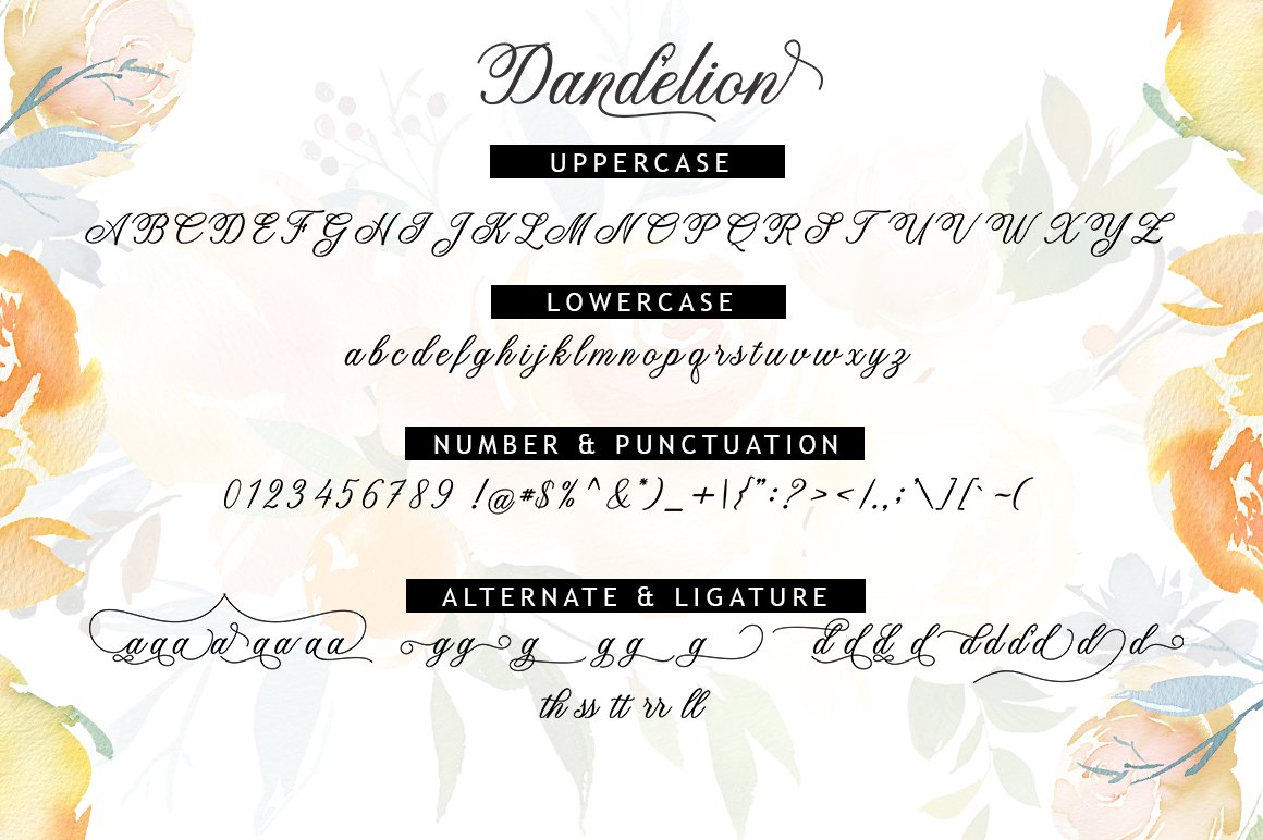 Dandelion Script is elegant calligraphy font, designed to convey elegance and style. It is slender, feminine and friendly, This font is casual and pretty with swashes. Can used for various purposes. such as logo, product packaging, wedding invitations, branding, headlines, signage, labels, signature, book covers, posters, quotes and more. Dandelion Script Script features OpenType stylistic alternates, ligatures and International support for most Western Languages is included. To enable the OpenType Stylistic alternates, you need a program that supports OpenType features such as Adobe Illustrator CS, Adobe Indesign & CorelDraw X6-X7, Microsoft Word 2010 or later versions.