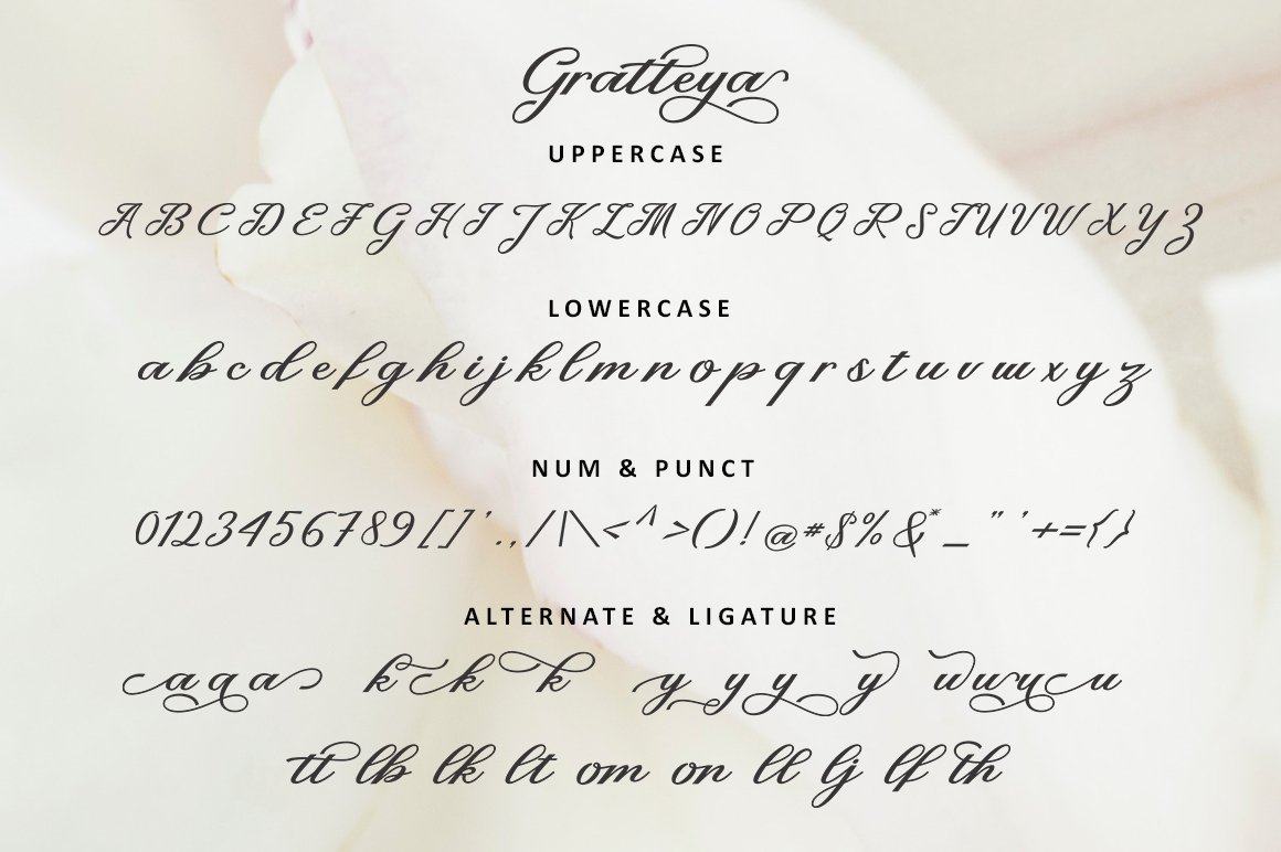 Introducing the latest styles Gratteya Script, A sweet calligraphy font, casual and dynamic with a dancing baseline, This font can be used easily and simply, perfect for Branding, Logos, Greeting Cards, Wedding Stationery, Quotes etc. It comes with a handy set of Opentype Stylistic Alternates, Ligatures and multiple language support. To enable the OpenType Stylistic alternates, you need a program that supports OpenType features such as Adobe Illustrator CS, Adobe Indesign & CorelDraw X6-X7, Microsoft Word 2010 or later versions.Files included: