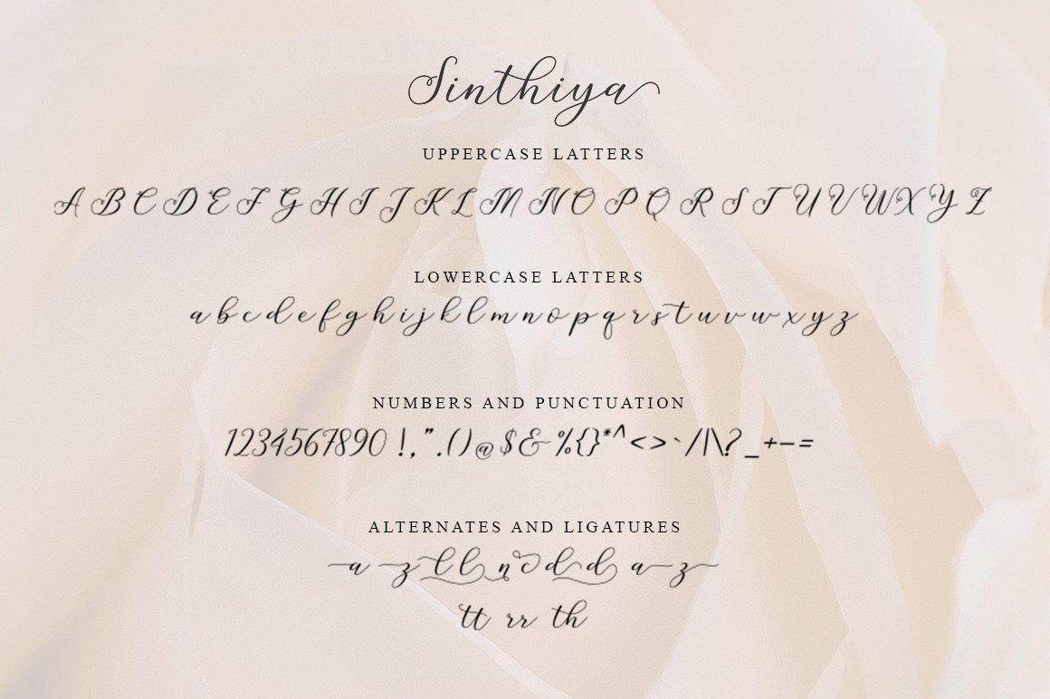 Introducing the latest styles Sinthiya Script, A sweet calligraphy font, casual and dynamic with a dancing baseline, This font can be used easily and simply, perfect for Branding, Logos, Greeting Cards, Wedding Stationery, Quotes etc. It comes with a handy set of Opentype Stylistic Alternates, Ligatures and multiple language support. To enable the OpenType Stylistic alternates, you need a program that supports OpenType features such as Adobe Illustrator CS, Adobe Indesign & CorelDraw X6-X7, Microsoft Word 2010 or later versions.