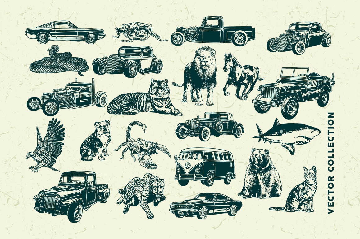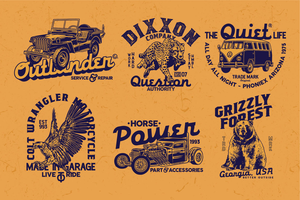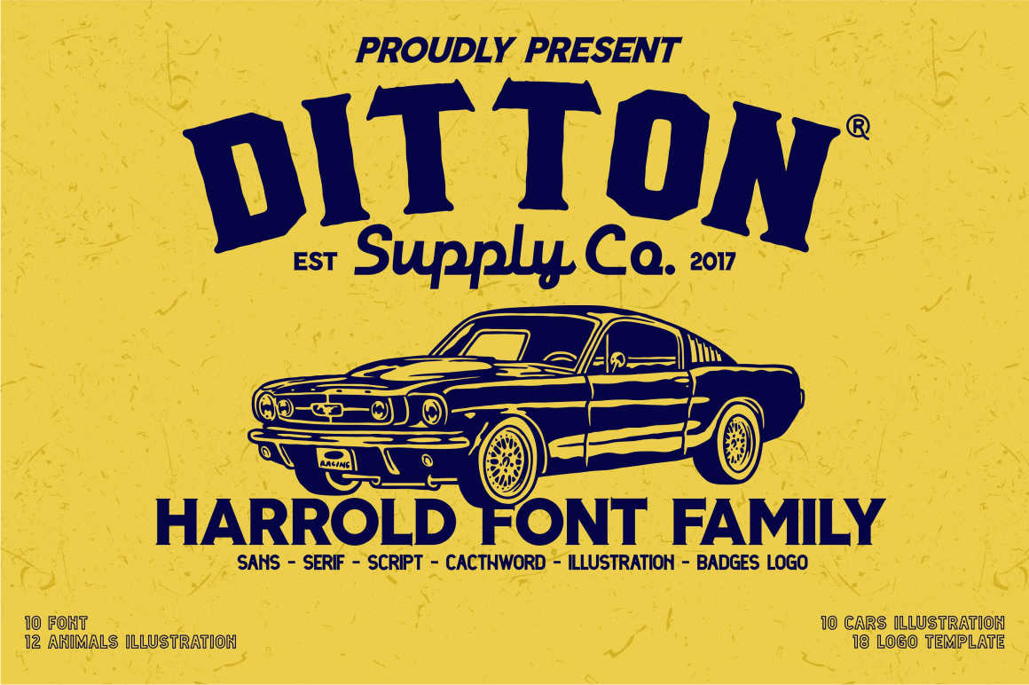Harrold Font Family includes 10 fonts that have different styles from each other but at the same time perfectly paired when used together create your best design with this font for any purposes suck as t-shirts, logos, poster design, magazine, mark, and others. This is essentially 10 fonts being released together instead of separately. 10 Fonts, 18 Premium Logo Templates, 22 Vector Illustrations (Animal & Vintage Cars)