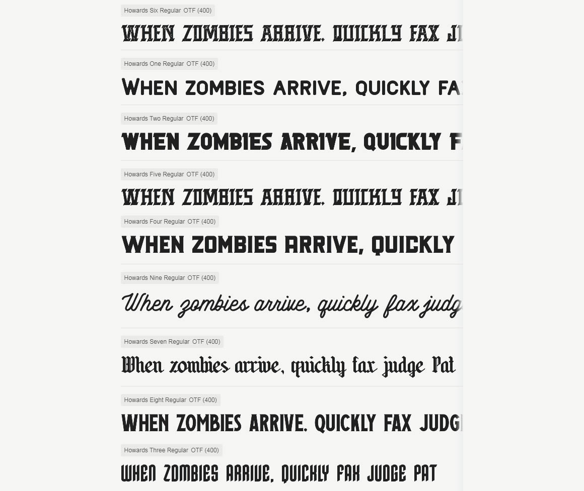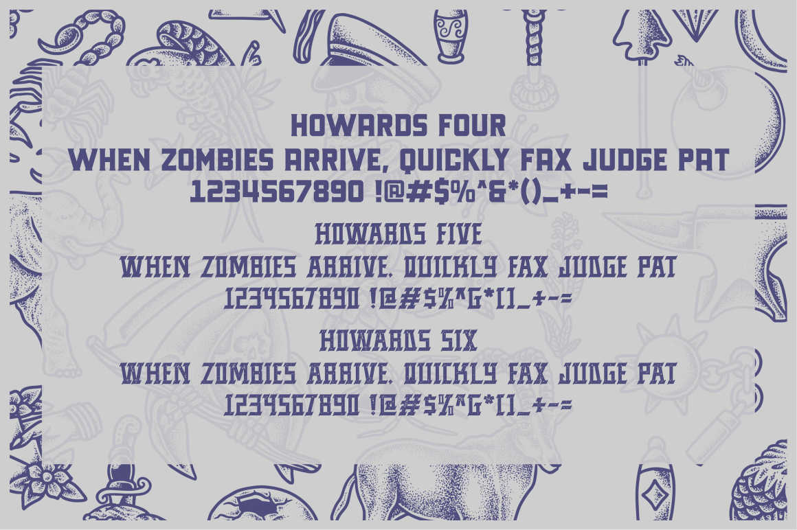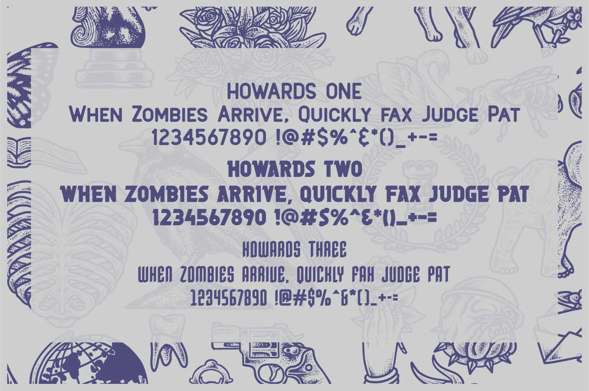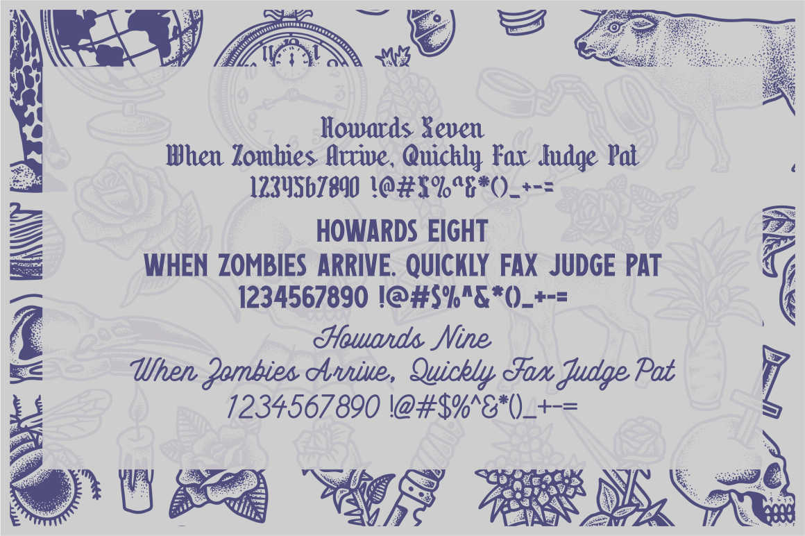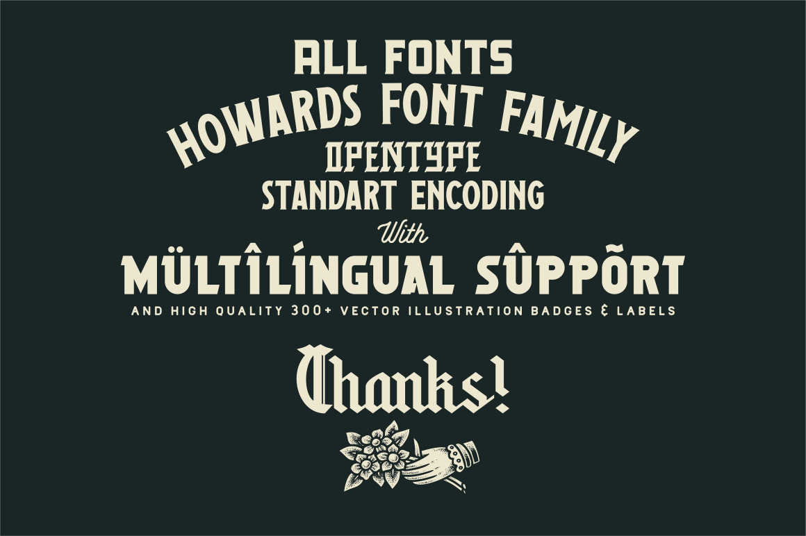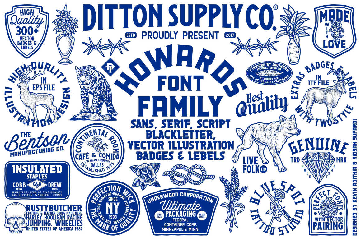 Howards Font Family includes 9 fonts that have different styles from each other but at the same time perfectly paired when used together create your best design with this font for any purposes suck as t-shirts, sign, sticker, logos, poster design, magazine, mark, and others. This is essentially 9 fonts being released together instead of separately. 9 Fonts, 300+ Vector Illustrations, Badges and Labels and 50 Logo template(update)