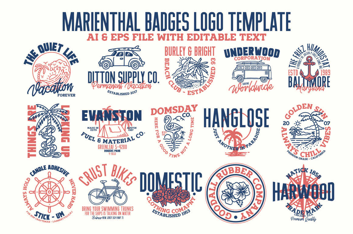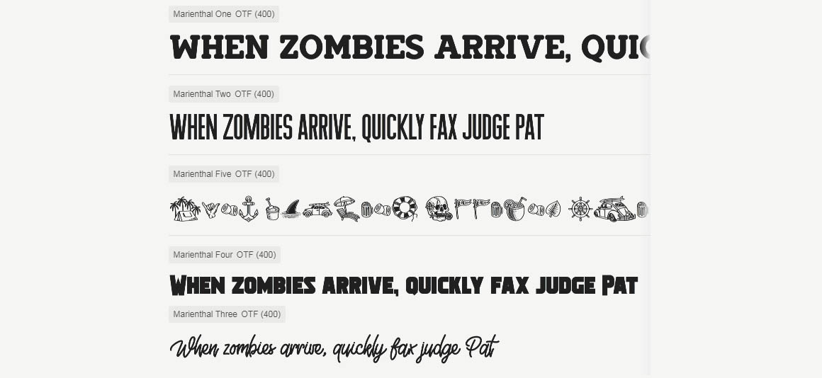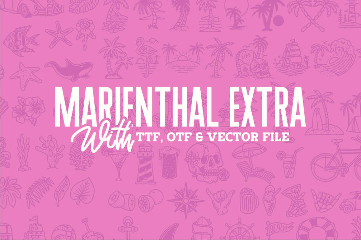 Marienthal Font Family includes 4 Font and Summer Vector Collections that have different styles from each other but at the same time perfectly paired when used together create your best design with this font for any purposes suck as t-shirts, sign, sticker, logos, poster design, magazine, mark, headings, logo type, quotes, apparel design, invitations, flyers, greeting cards, product packaging, book cover, and others. This is essentially 4 fonts being released together instead of separately. 4 Fonts, 90+ Summer Vector Illustrations, and 15 Logo template.