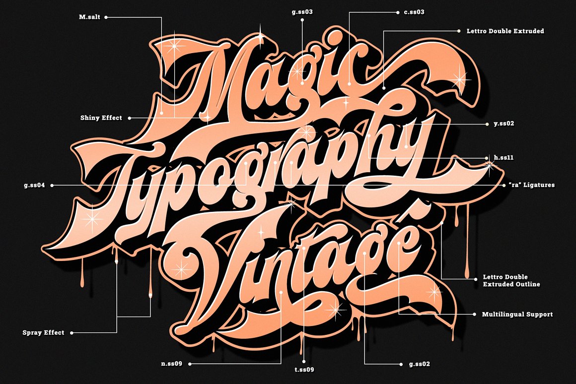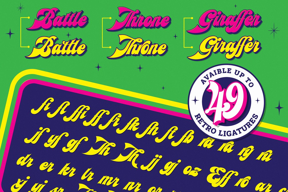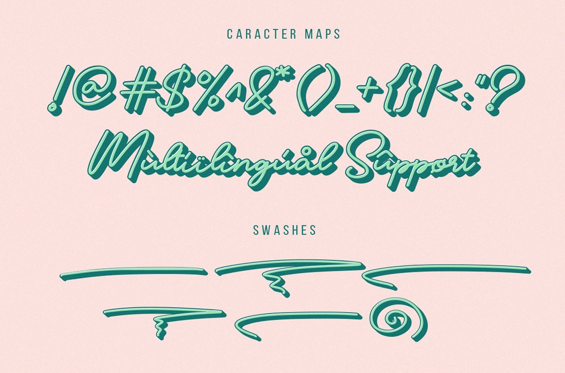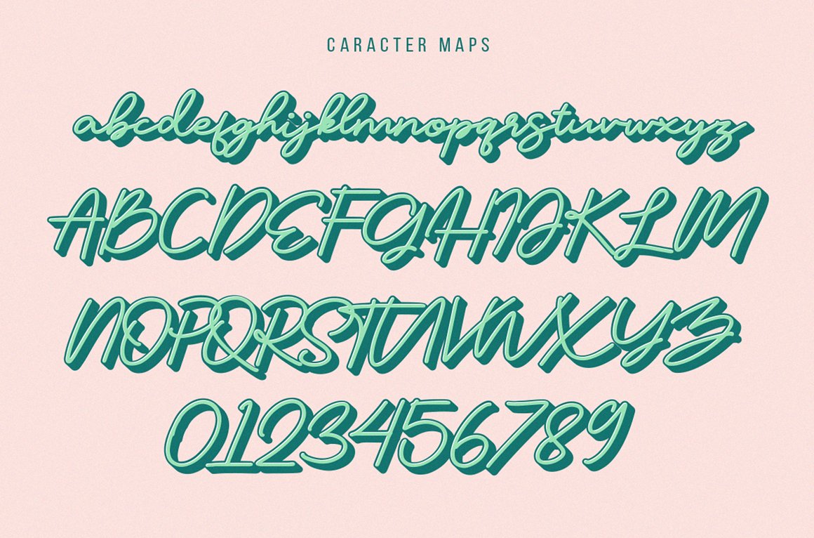 Make your own retro design with Lettro Font! Lettro is an exquisite bold script typeface inspired by the retro design from 70-80-ish. Lettro is Created with a ton of stylistic alternates, swashes, and ligatures, and also comes with 5 total Layered fonts: Regular, Extrude, Extrude Outline, Double Extruded, and Double Extruded Outline. Perfect fitted layer to give you more contrast, more bold look of the title. Every glyph for alternates is curated for the best and possible without eliminating the characteristic of these fonts! Combine that many styles and create an awesome retro design! This retro typeface is perfect for logotypes, t-shirts, vintage badges, retro quotes, branding, packaging, posters, signboards, social media needs, etc.