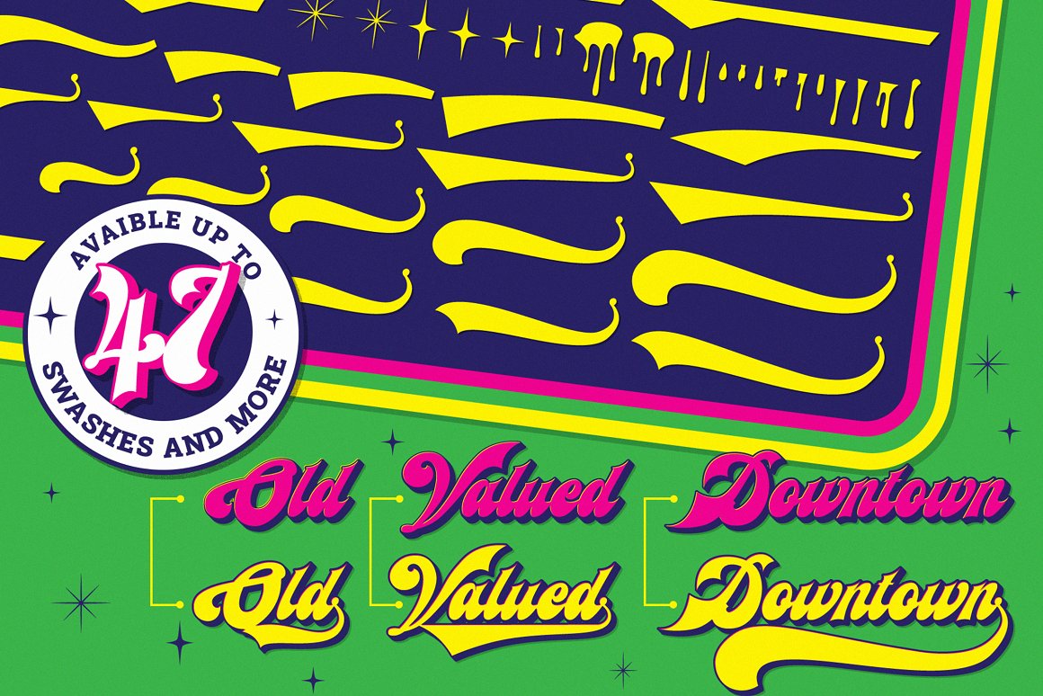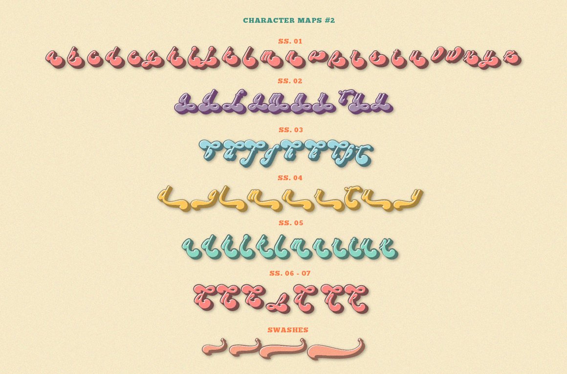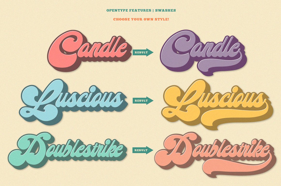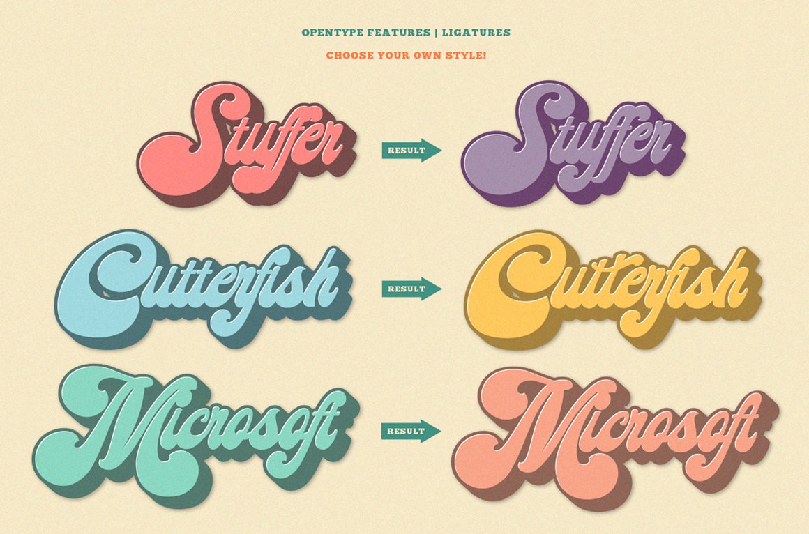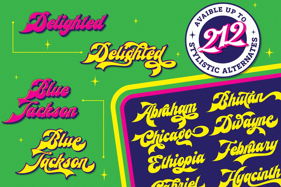 Make your own retro design with Lettro Font! Lettro is an exquisite bold script typeface inspired by the retro design from 70-80-ish. Lettro is Created with a ton of stylistic alternates, swashes, and ligatures, and also comes with 5 total Layered fonts: Regular, Extrude, Extrude Outline, Double Extruded, and Double Extruded Outline. Perfect fitted layer to give you more contrast, more bold look of the title. Every glyph for alternates is curated for the best and possible without eliminating the characteristic of these fonts! Combine that many styles and create an awesome retro design! This retro typeface is perfect for logotypes, t-shirts, vintage badges, retro quotes, branding, packaging, posters, signboards, social media needs, etc.