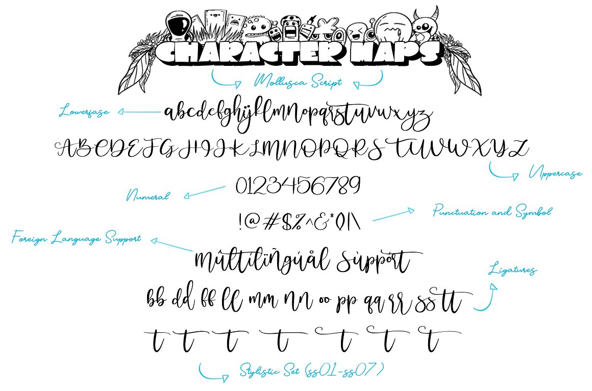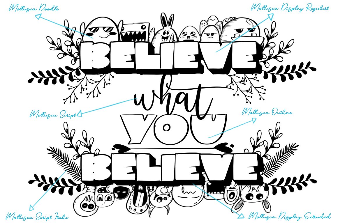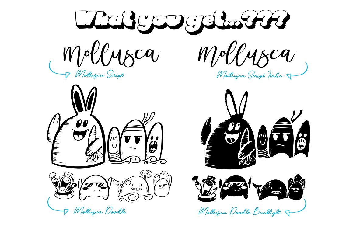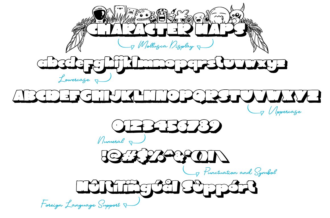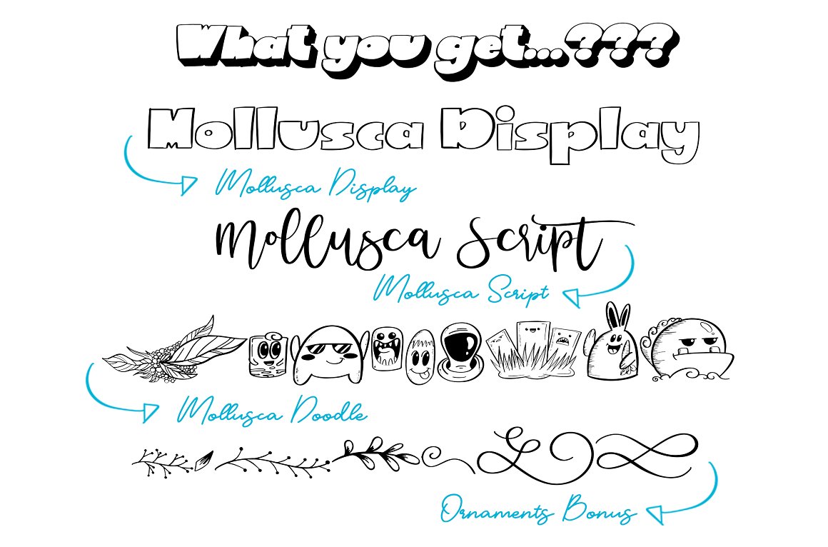 Mollusca is a font that includes three amazing typefaces! First, you will get a Mollusca Display – a bold and fun display typeface that is very suited for your cartoony design. It also included Mollusca Display Extruded version which can be useful for any doodle-like style! Then, the second typeface is Mollusca script – a script and stylistic typeface that includes ligatures and a unique feel! Combine both display and script versions to make your outstanding design! The last but not least, you will get a super unique handcrafted doodle font which we called Mollusca doodle! These three musketeers will make an incredible combo for your beloved project! Don’t forget, we also give you beautiful ornaments to make your combo more perfect! This font is really perfect for logo design, t-shirt, vintage and cartoony badge, quotes, branding, packaging, comic, cartoon design, cute wallpaper, book cover, etc.