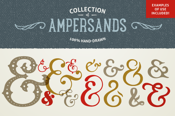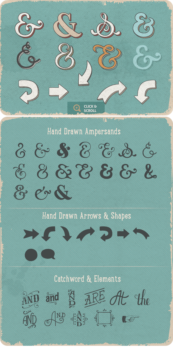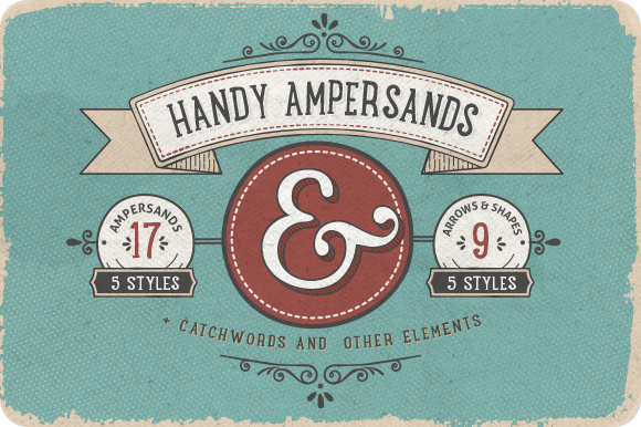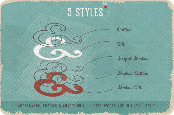 Handy Ampersands font comes in 5 styles: Fill, Outline, Striped Shadow, Shadow Outline, Shadow Fill. You are getting 17 hand drawn ampersands and other elements that can be used in any kind of design: wedding invitations, vintage style banners, you can even get a tattoo using one of the ampersands. Here is what’s included: 17 ampersands in 5 styles, 9 arrows & shapes in 5 styles, 9 catchwords & 2 additional elements – frame and pointing hand.