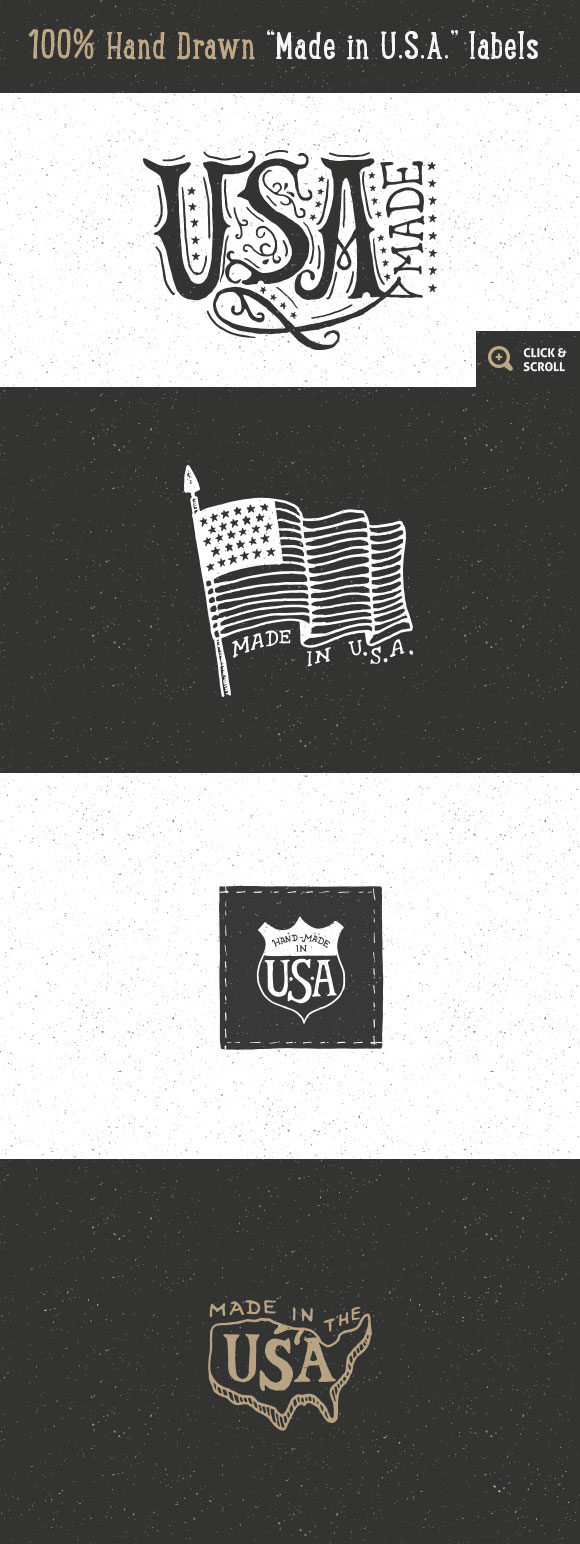 12 unique hand drawn “Made in U.S.A.” labels. Seamless texture included. Here is what you get: .PSD with all labels on separate layers (texture included as a smart object), AI and EPS files.