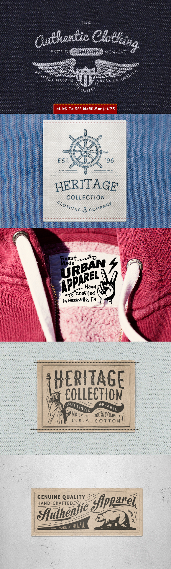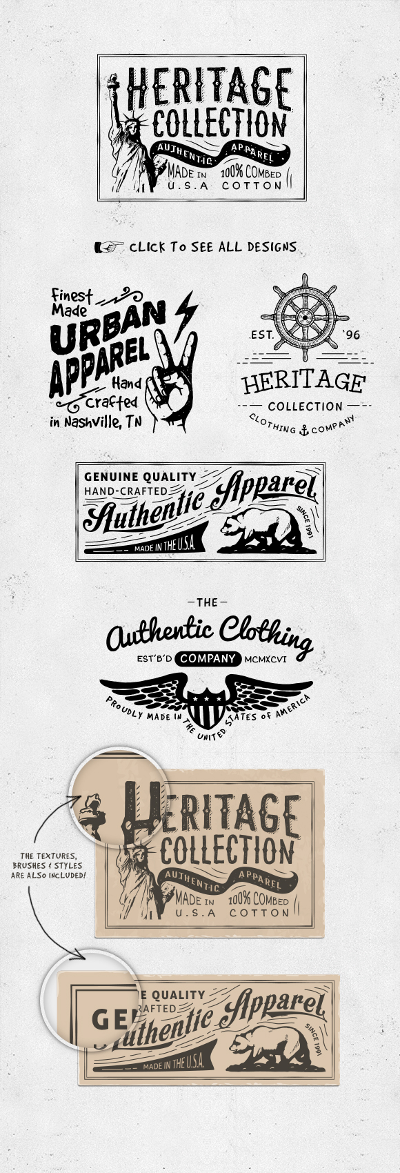 5+ hand drawn apparel label designs. 100% Vector. All design elements are unique. All text is editable. Text styles & pattern brush & textures used in the labels are also included!