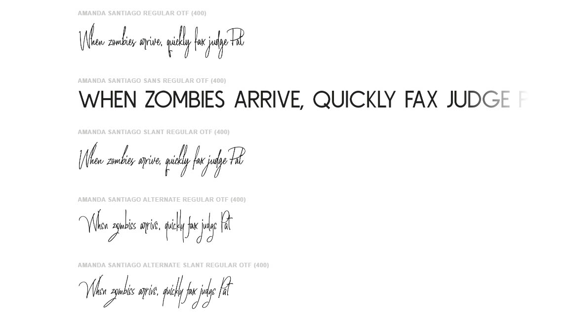 Amanda Santiago Font features uppercase, lowercase, numeral, punctuation & symbol, ligatures, multilingual support, PUA encoded.