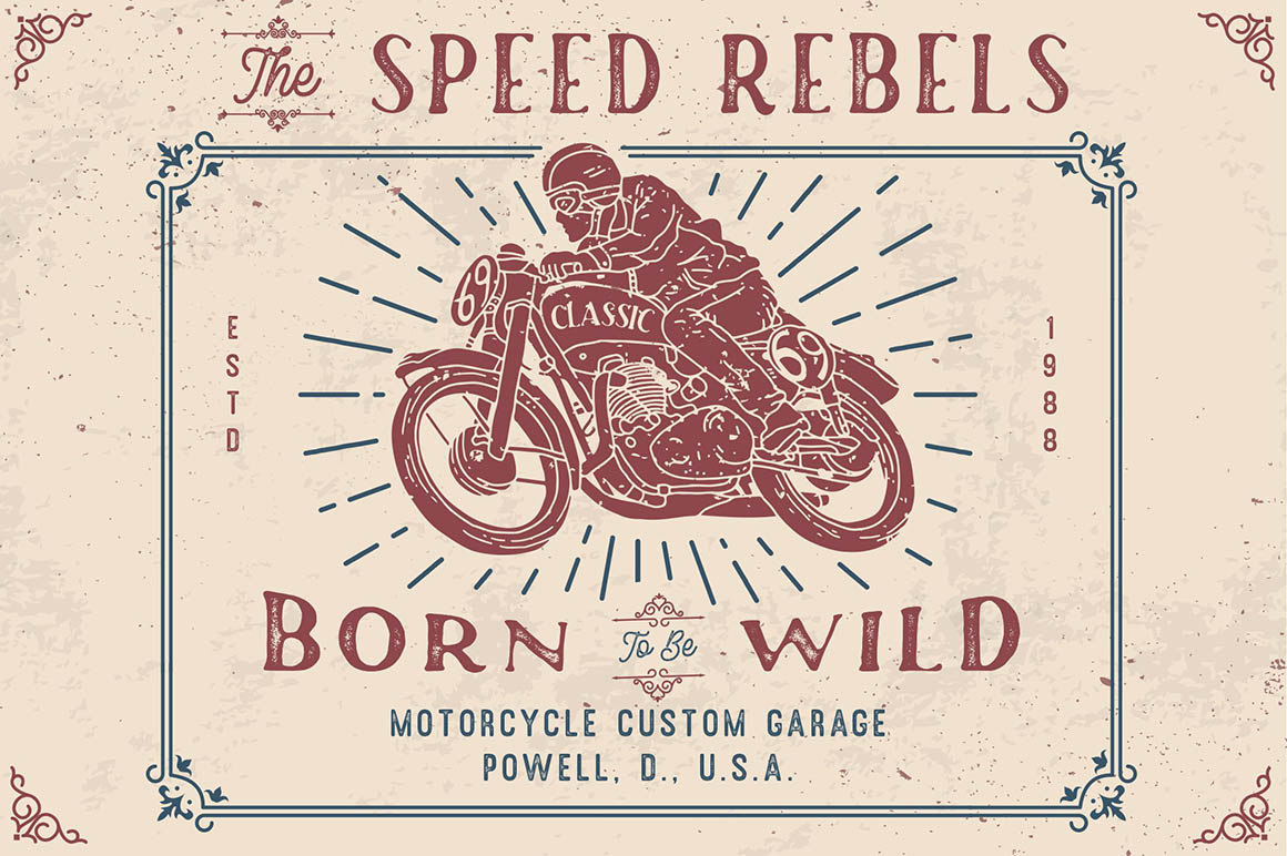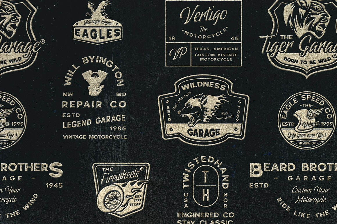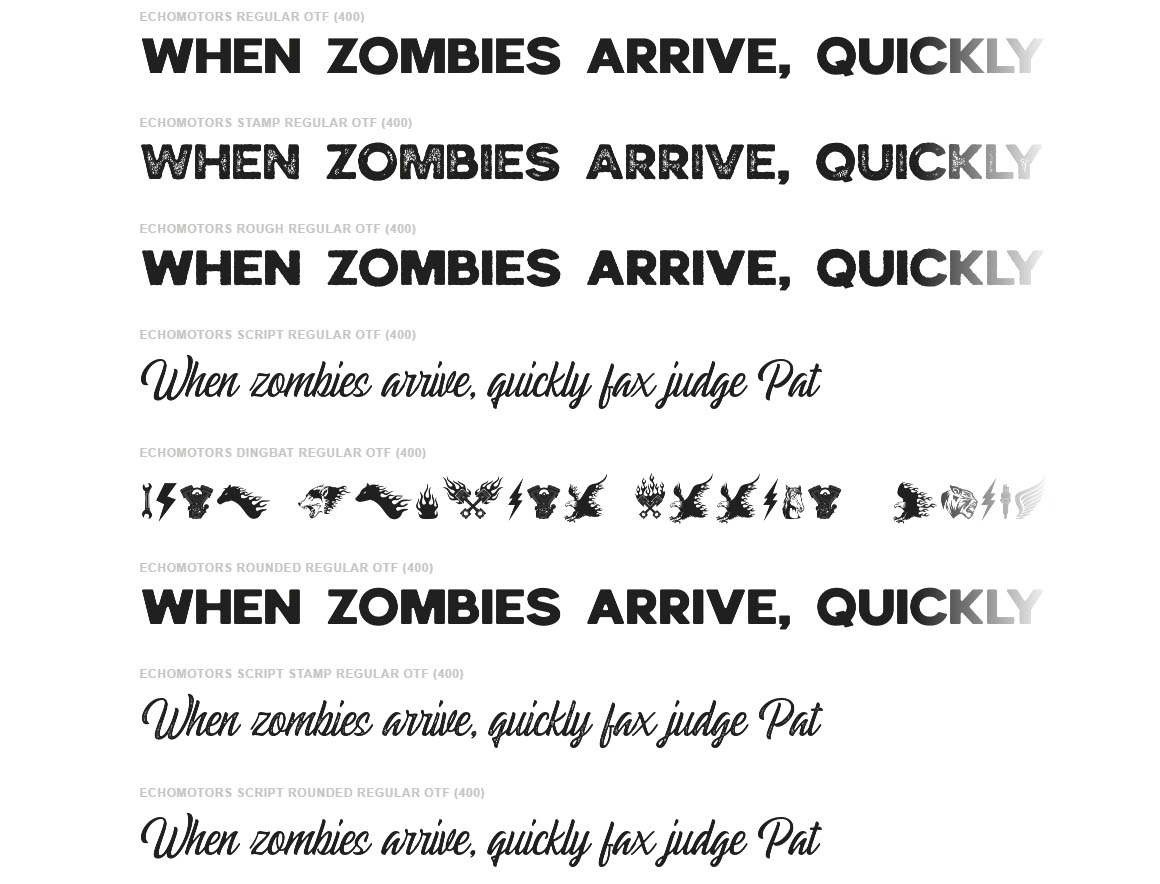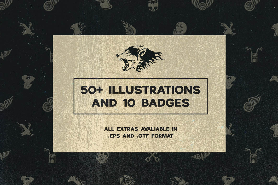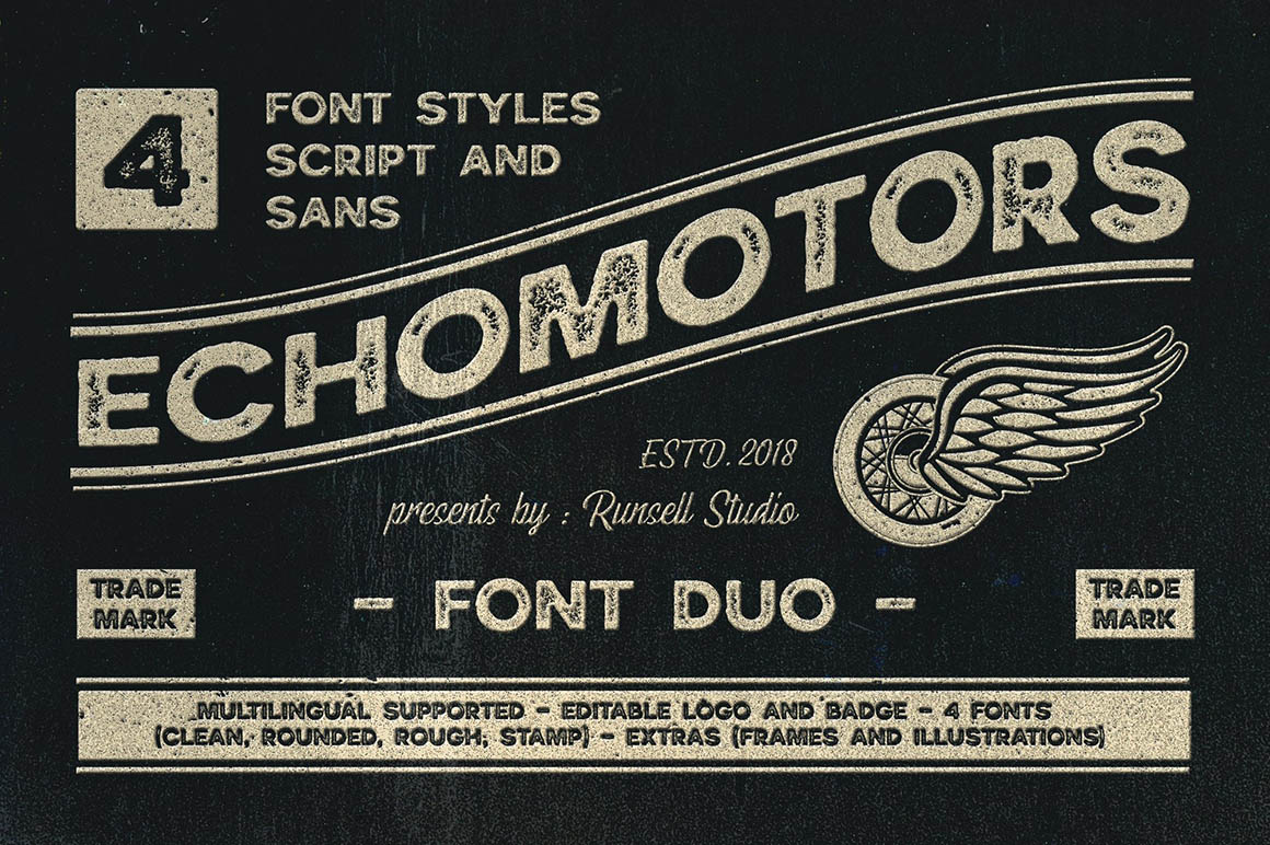 Echomotors fonts have extras illustrations, badges, and logo templates editable in eps and dingbat format. There are five logotype vintage templates avaliable editables for more bonus. All of the sample badges avaliable editable or you can custom with different layout, frame badge, and illustrations.