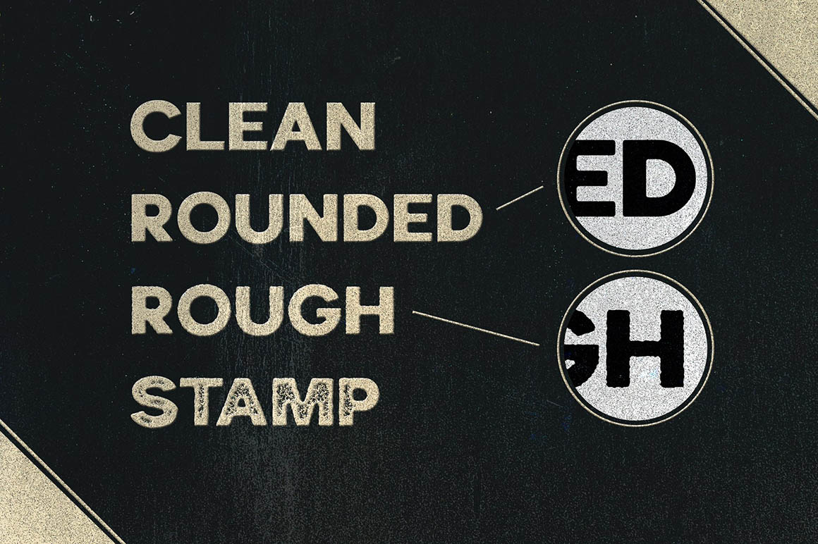 Echomotors Font features uppercase, lowercase, numeral, punctuation & symbol, ligatures, stylistic alternates for script, multilingual support, PUA encoded (fully accessible without additional design software), 4 style (clean, rounded, rough and stamp).
