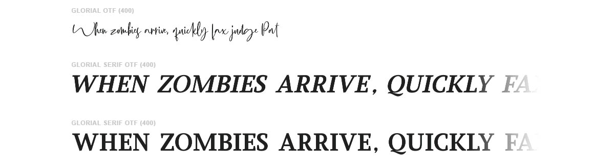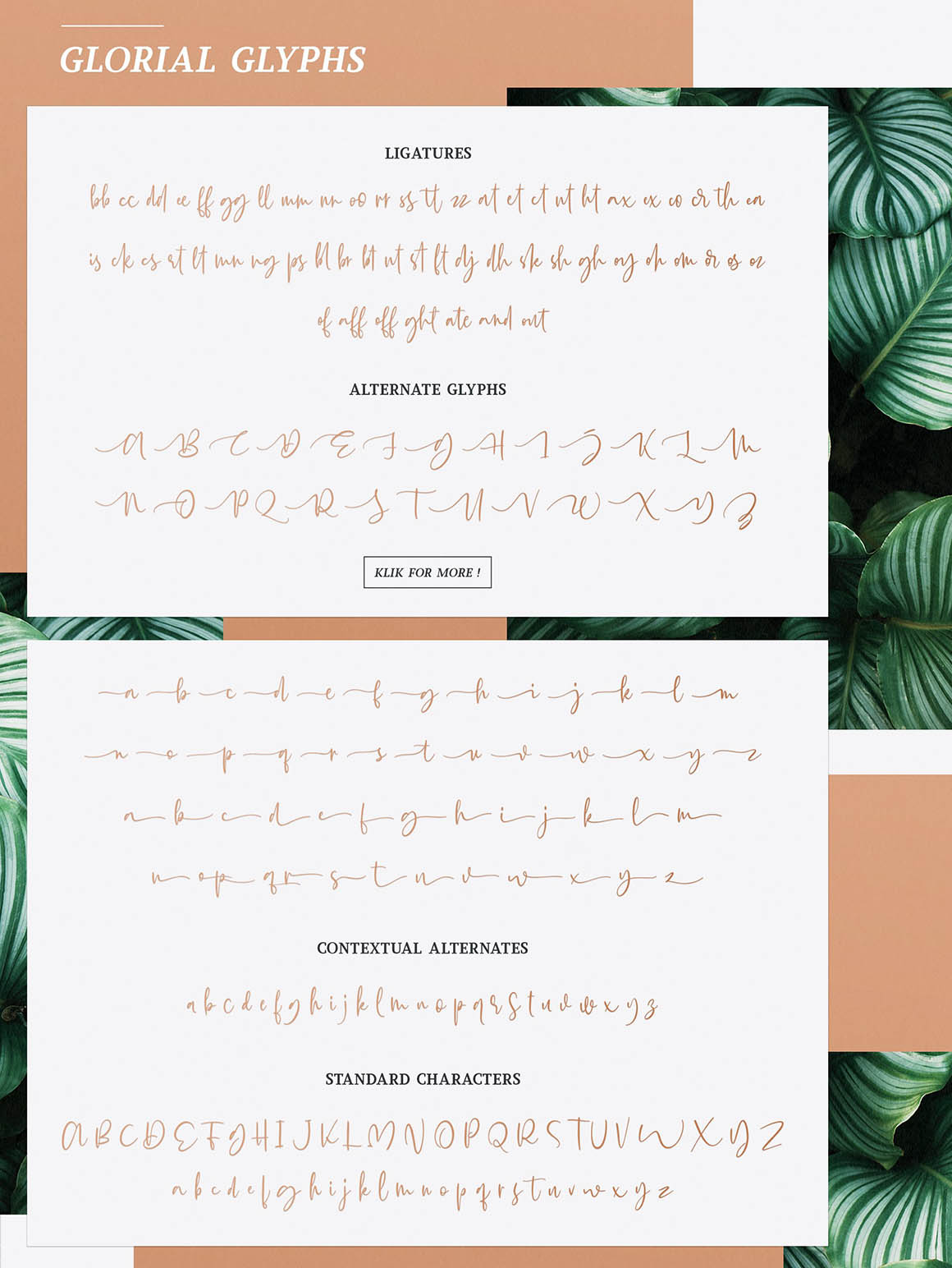 The handwritten calligraphy script works perfectly together with contemporary serif (regular and slant). Glorial Script includes a full set of uppercase & lowercase letters with beginning swashes , a full set of lowercase letters with ending swashes, a full set of contextual alternates lowercase letters , 50+ ligatures features that makes the font look more natural.