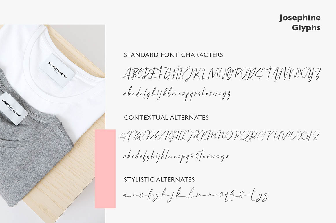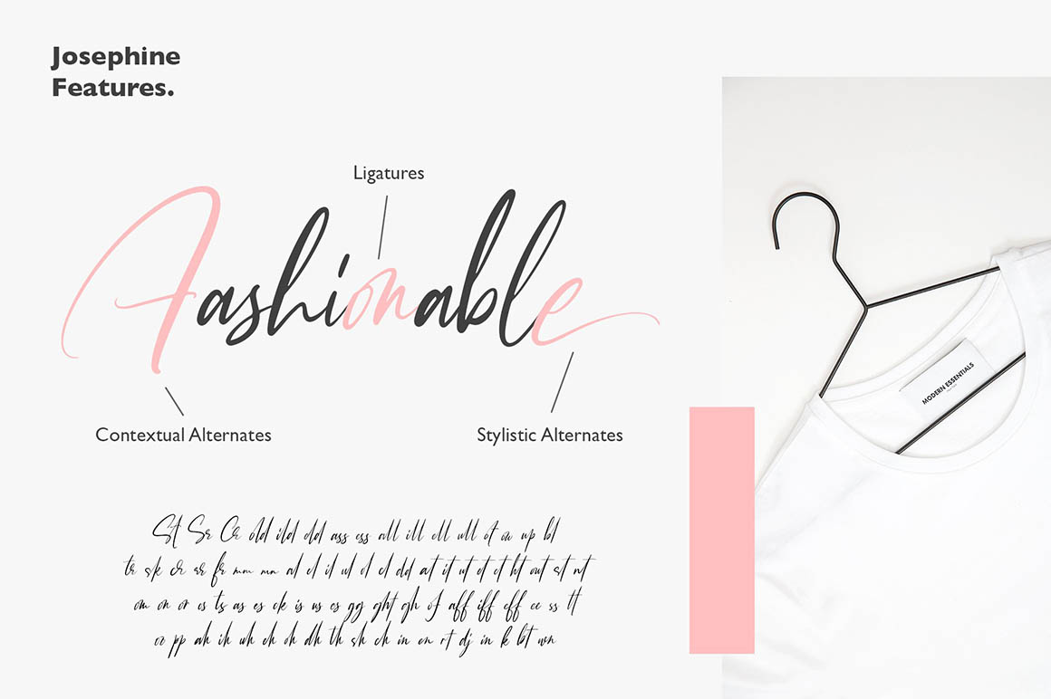 Josephine is a modern script typeface that every single letter contains beautiful characters alternates and feature ligatures. This font come with 70+ Ligatures, Contextual alternates, and Stylistic alternates. This font is stylish, fresh and ideal for adding the special look to your designs.