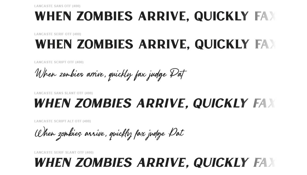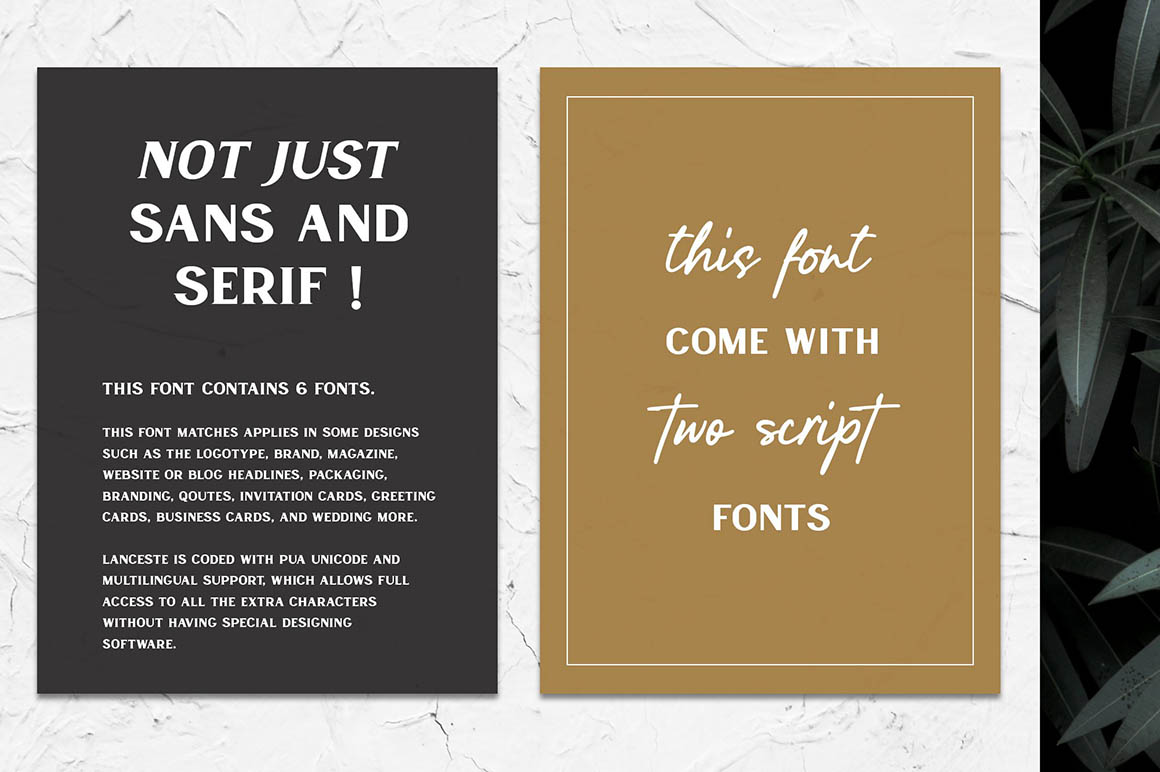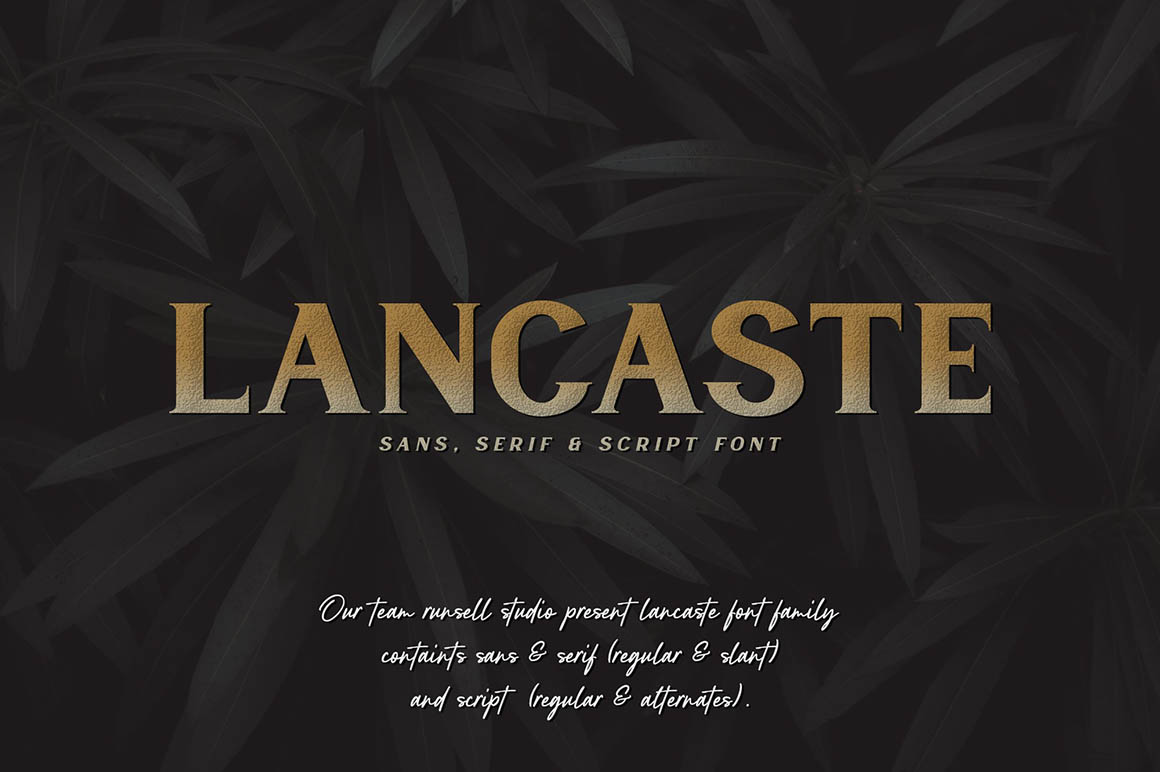 Lancaste come with 2 sans fonts (regular & slant), 2 serif fonts (regular & slant) and 2 script style fonts (Regular & Alternates). Perfect combination fonts with 3 styles typeface (regular, alternates & slant) for applying your designs. This font matches applies in some designs such as the logotype, brand, magazine, website or blog headlines, packaging, branding, quotes, invitation cards, greeting cards, business cards, wedding and more custom design.