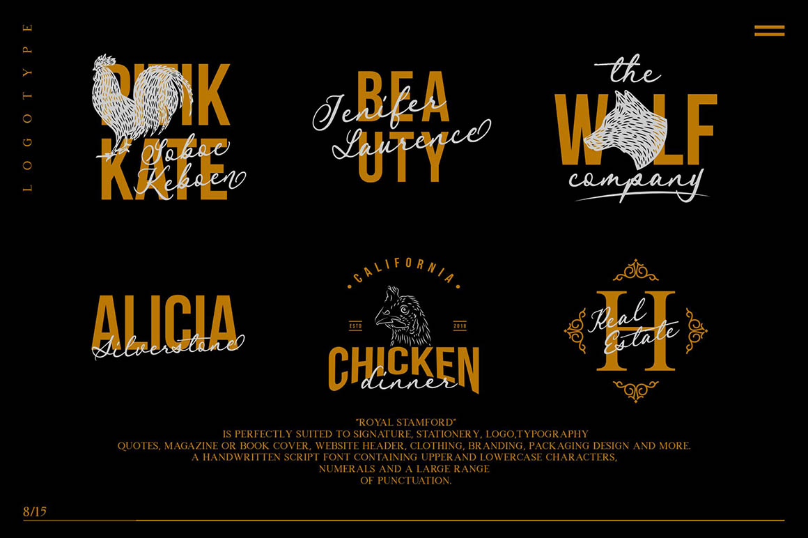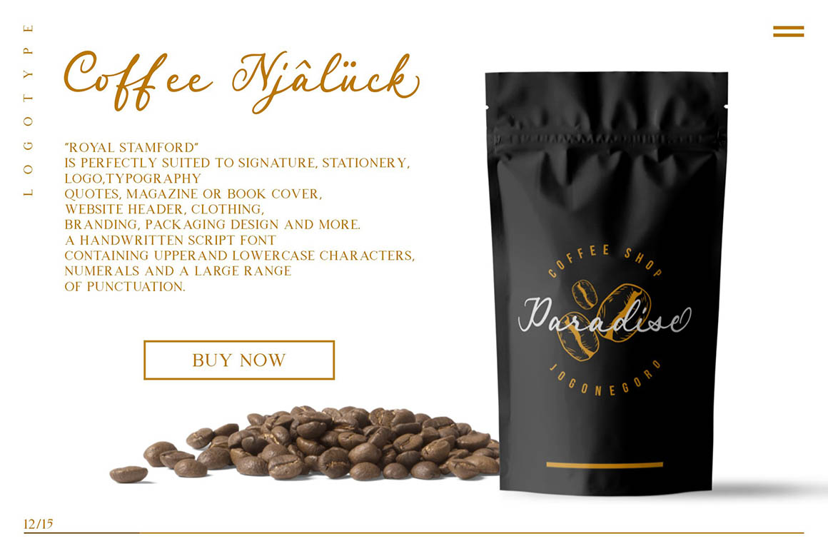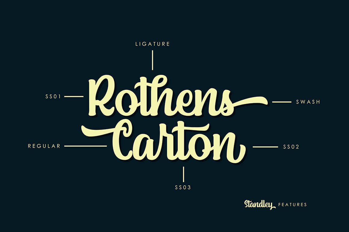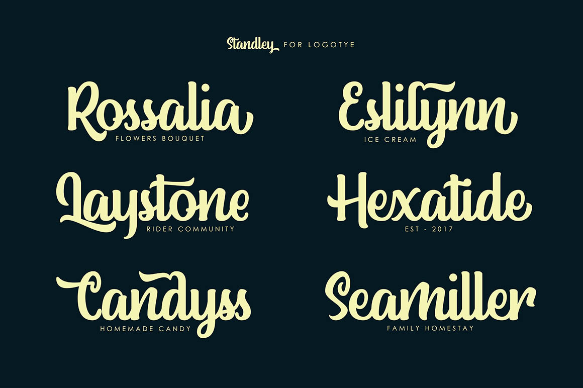 Standley upright style is great for logotype, typography, poster, printed quotes, invitations, cards, product packaging, headers, letterhead, apparel design, label, and etc.