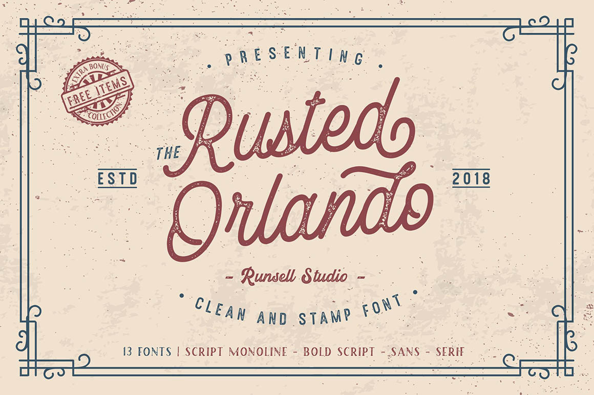 Runsell Studio presenting a new product different as before, Rusted Orlando. We make a new vintage fonts included 13 fonts : monoline script, bold script, sans and serif fonts. Each font there are 2 style : clean and stamp that can support your vintage style.
