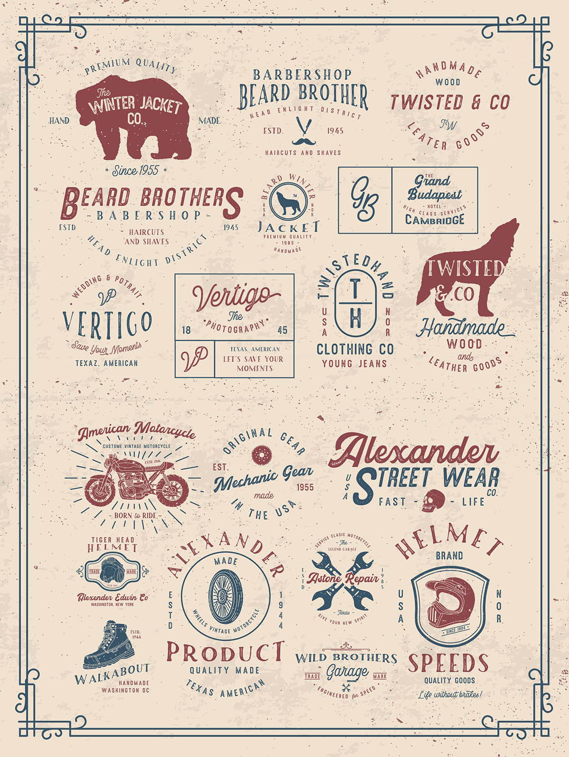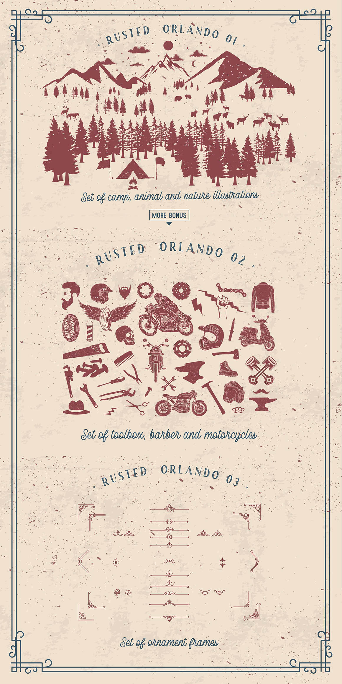 This font is suitable for logos, branding, packaging, t-shirt design, and many other vintage design. This product has many additional bonuses to support design made like; illustrations (toolbox, barber, nature, animals, ride), frame ornaments, badges and logo templates. So, let’s try it and hope you enjoy this fonts of our product!