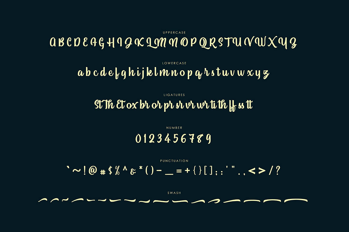 - 50+ Ligatures, Contextual alternates, Stylistic alternates, and Swash
