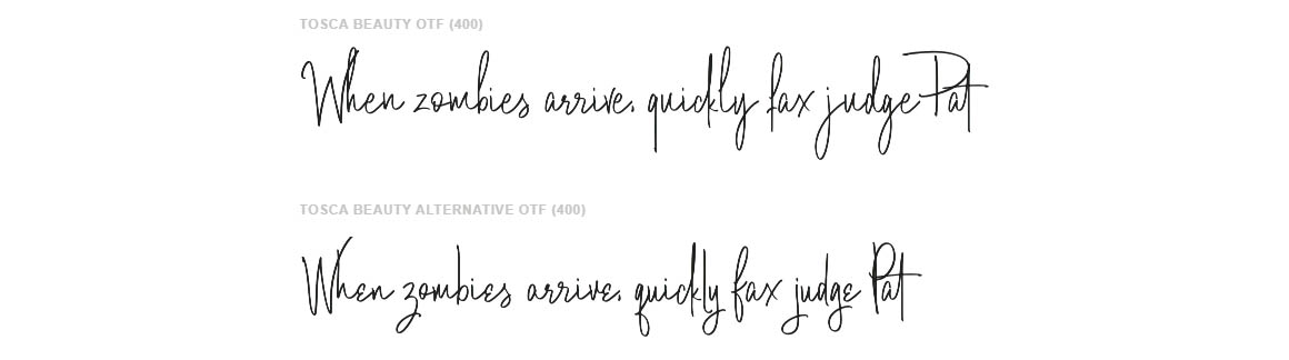 Tosca Beauty Font features uppercase, lowercase, numeral, punctuation & symbol, ligatures, multilingual support, PUA encoded.