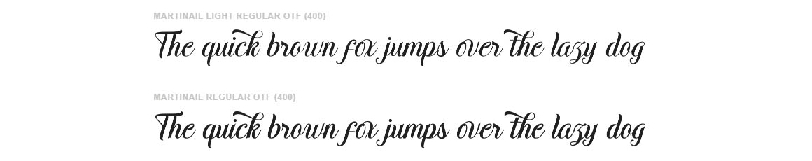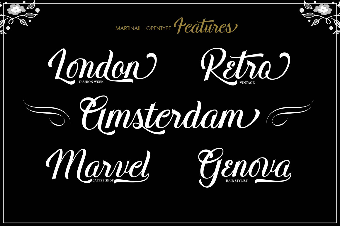 Martinail Script is a contemporary romantic calligraphic typeface, a mixture of retro script and modern sans serif. get a classic and elegant touch. Can be used for various purposes.such as logos, wedding invitation, t-shirt, letterhead, signage, lable, news, posters, badges etc.