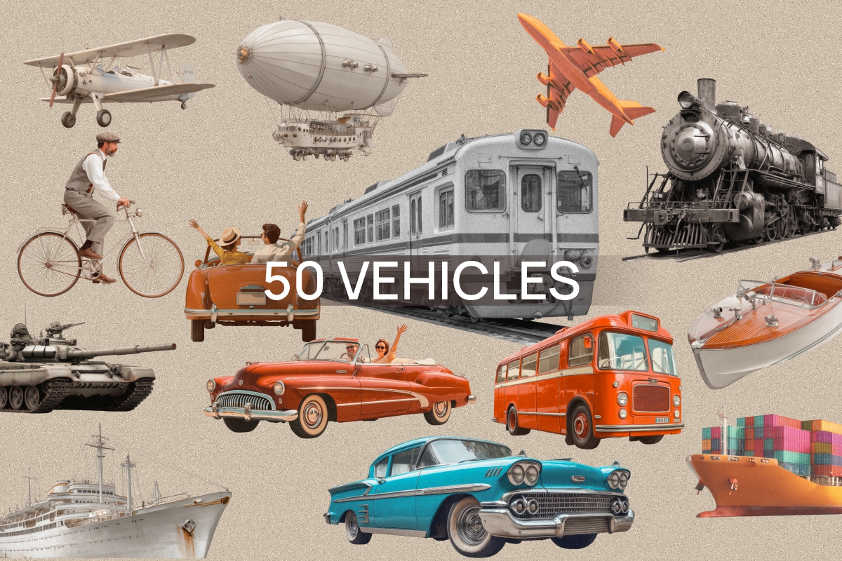 - 50 Vehicles – all vintage vehicles (PNG, Transparent Background)