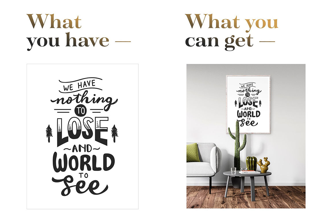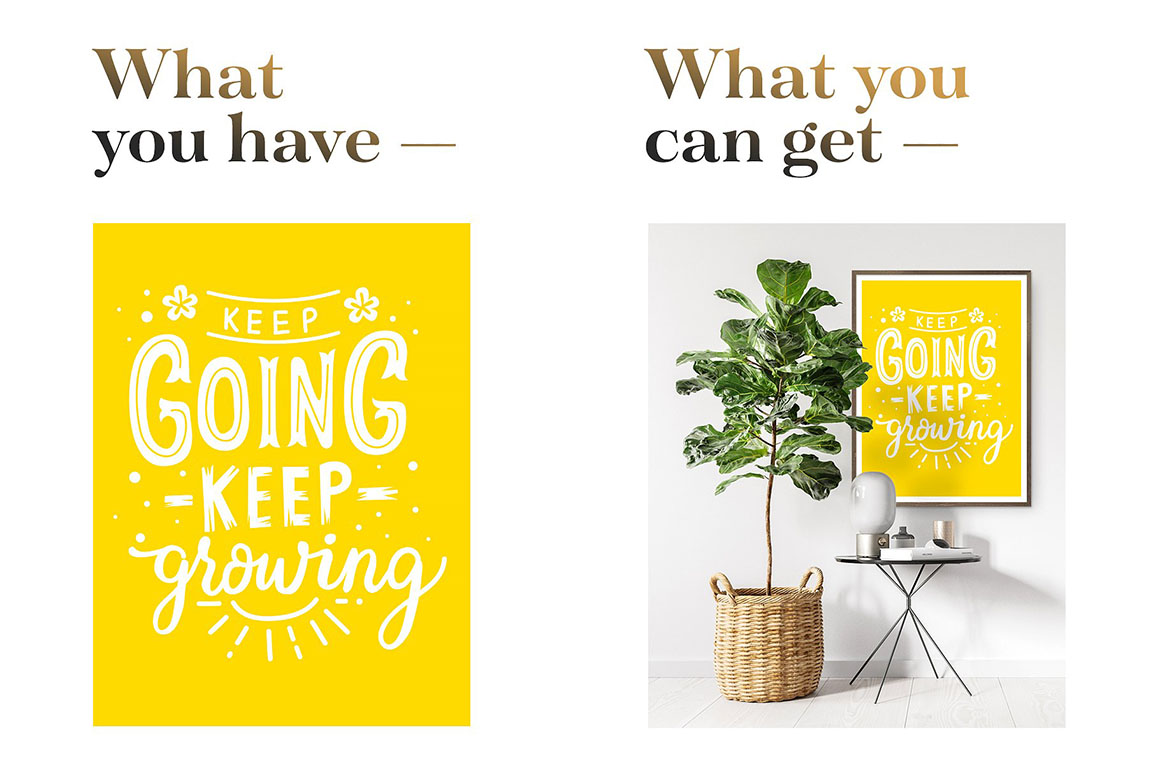 5. Artificial look – we’ve done our best to create the best quality mockups ever so you can be sure your prints will look stunning. More than that, you can use adjustments layers atached to change the exposure of your prints.
