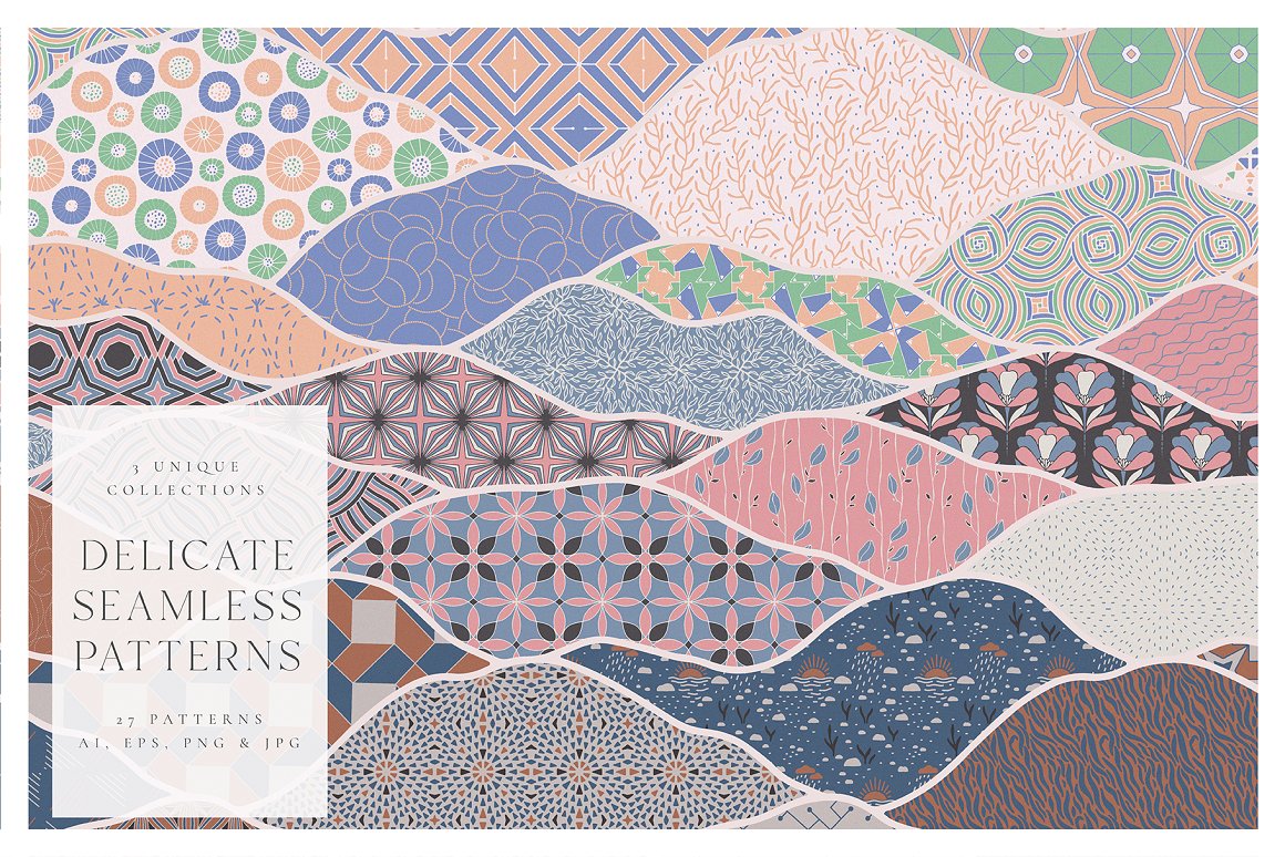 Delicate Seamless Patterns great for fabric, wallpaper, wrapping paper, posters, cards, branding, covers, gifts, social media accounts, scrapbooking, stickers, sites, blogs, invitations and much more!