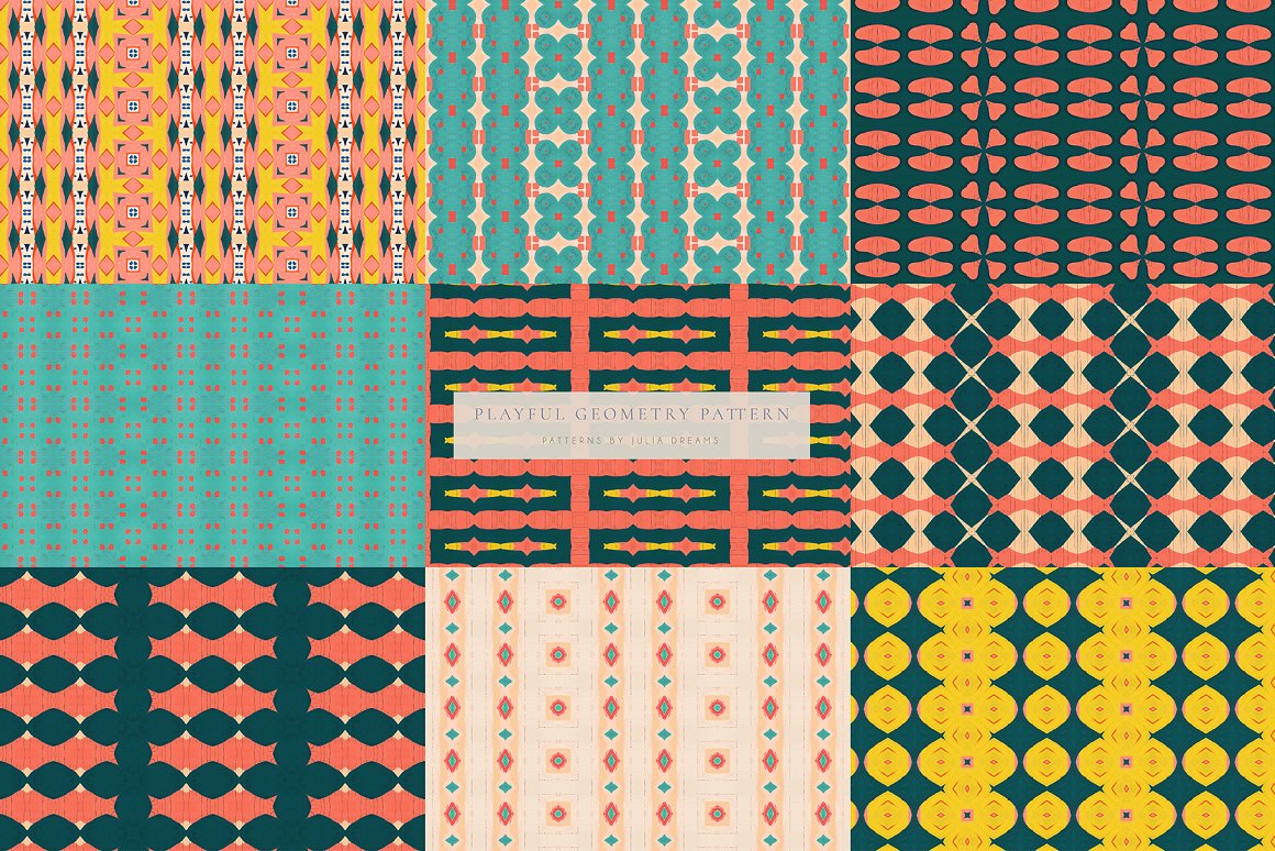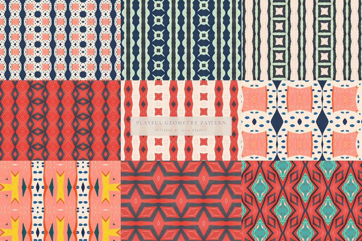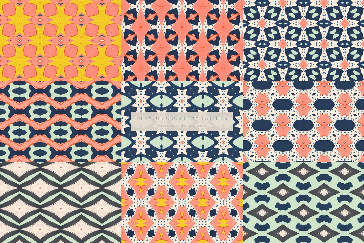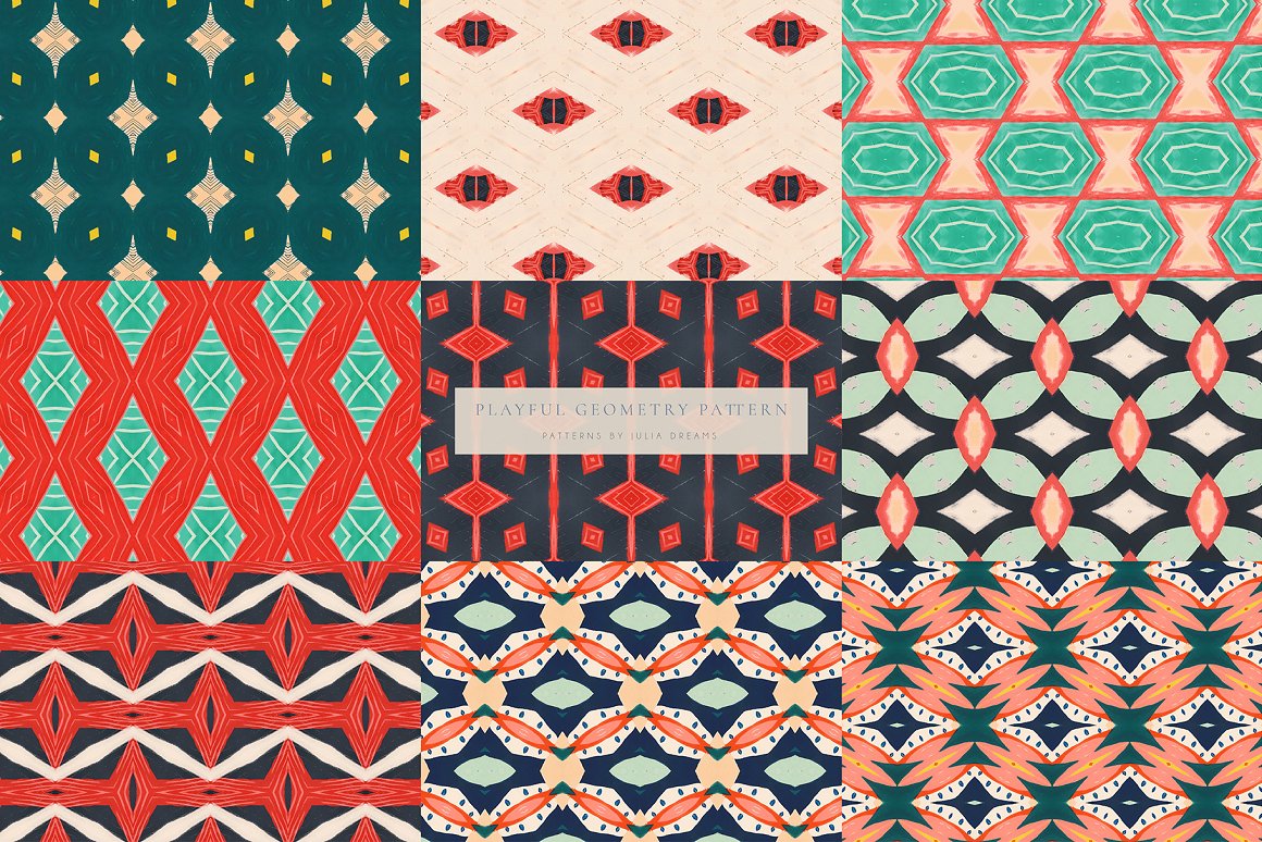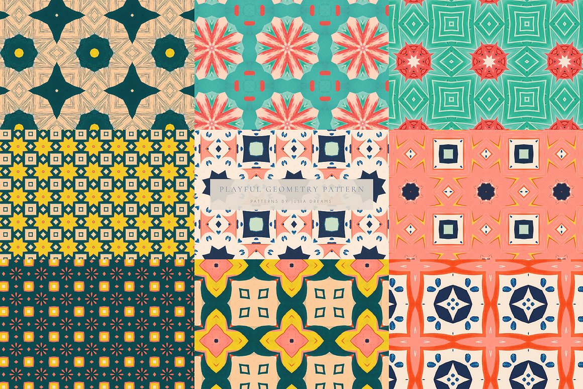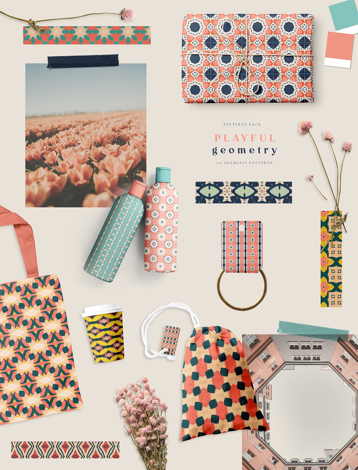 Playful Geometry Seamless Patterns great for fabric, wallpaper, wrapping paper, posters, cards, branding, covers, gifts, social media accounts, scrapbooking, stickers, sites, blogs, invitations and much more!