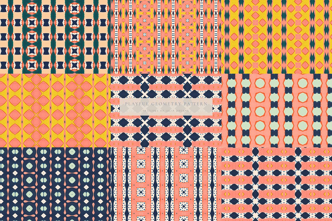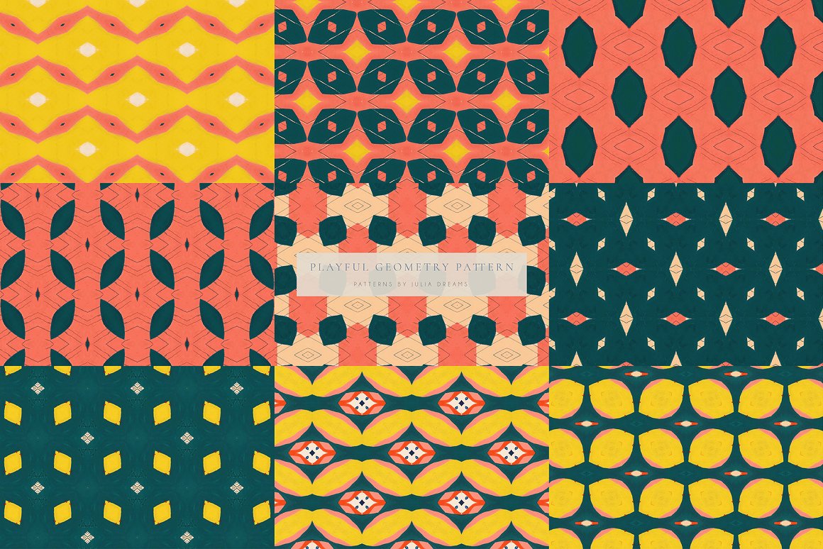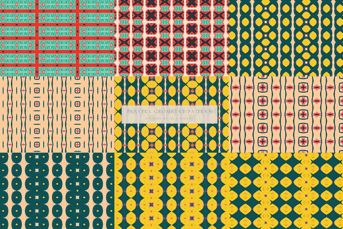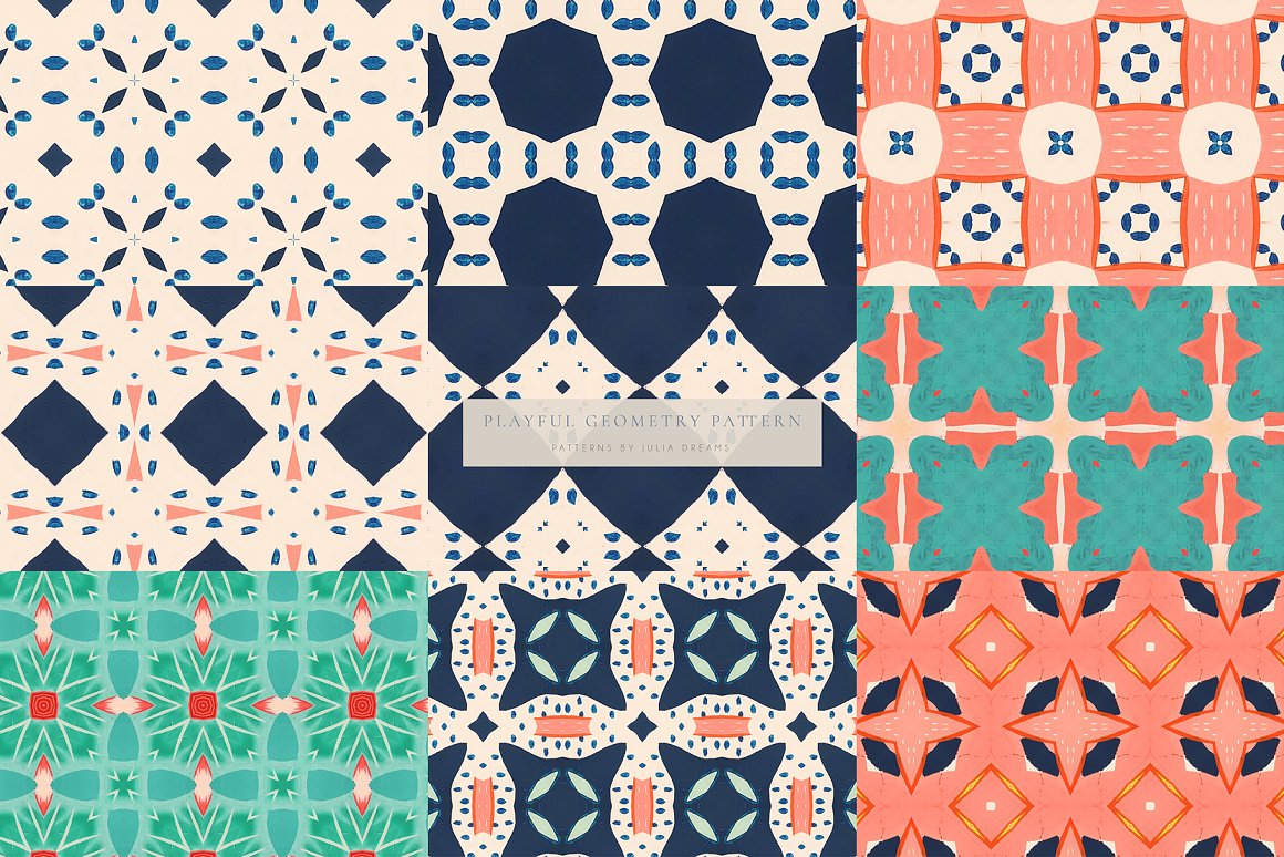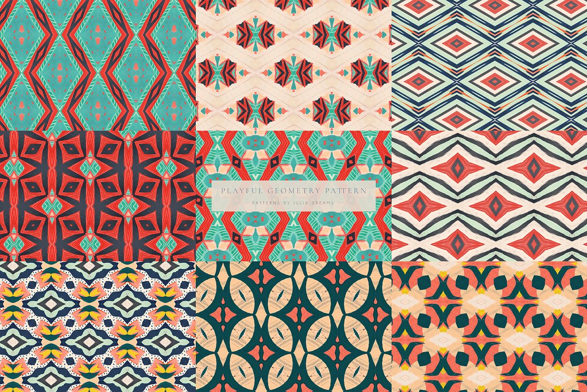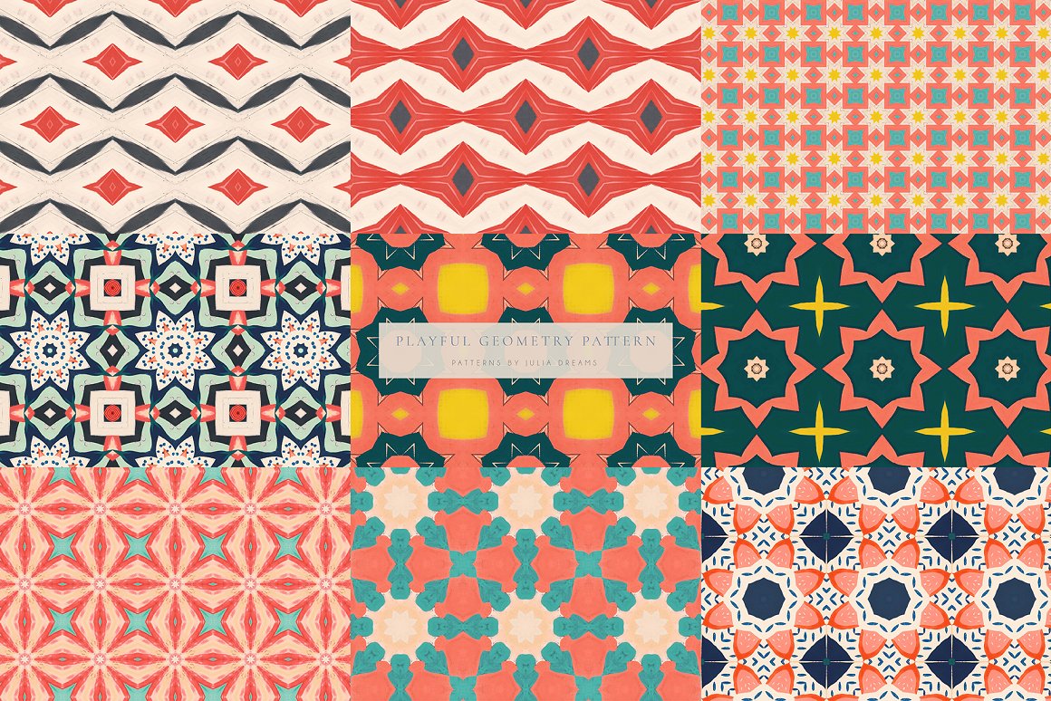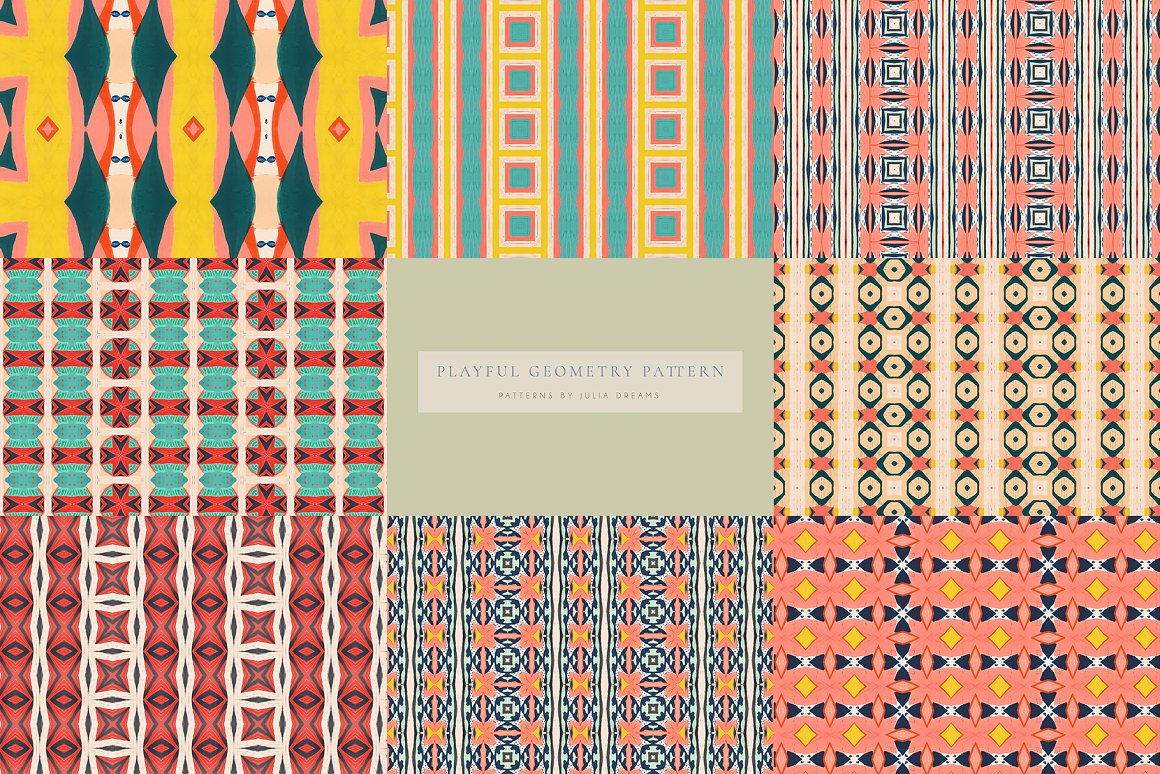 Playful Geometry Seamless Patterns great for fabric, wallpaper, wrapping paper, posters, cards, branding, covers, gifts, social media accounts, scrapbooking, stickers, sites, blogs, invitations and much more!