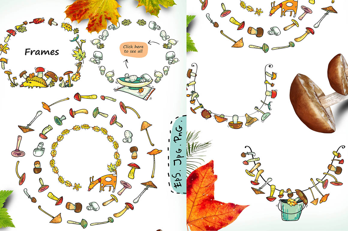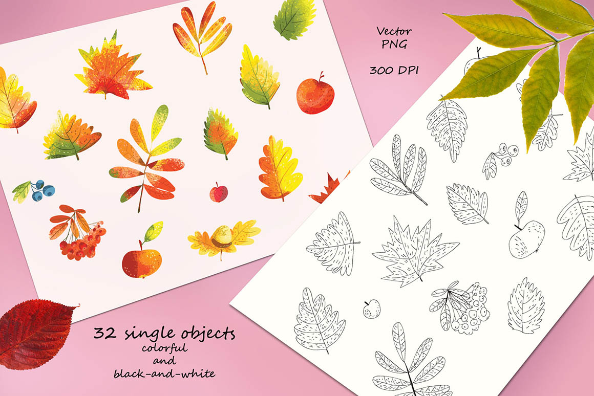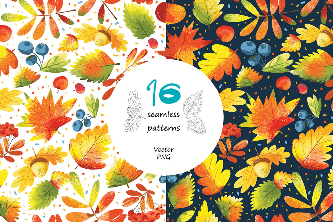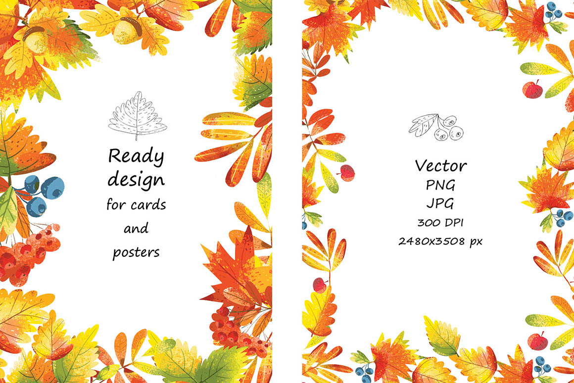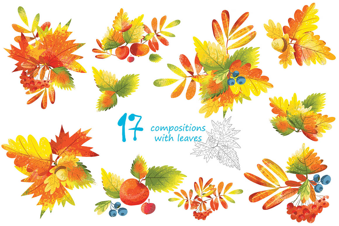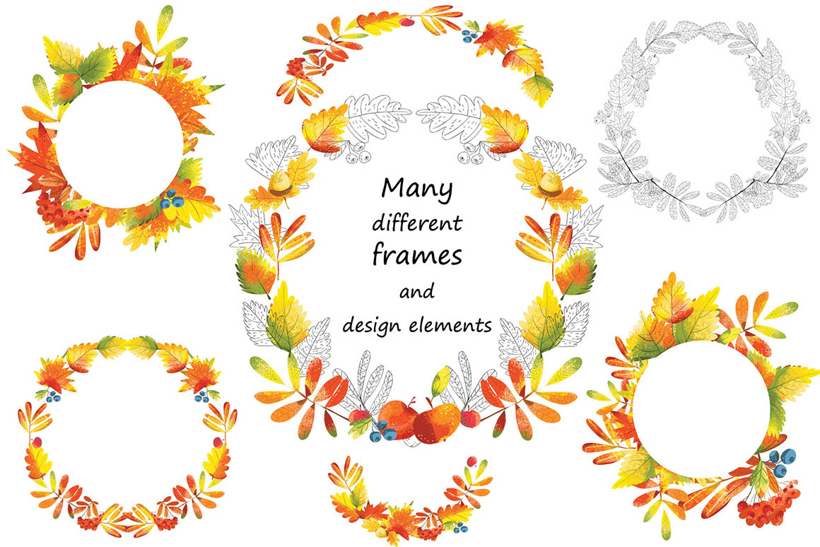 Use this collection for creating bright prints and greeting cards, WEB design, wallpapers, clothes patterns, for cool autumn invitations and illustrations. Make your Autumn warm and happy!