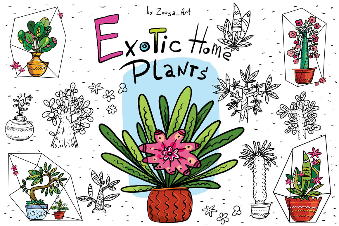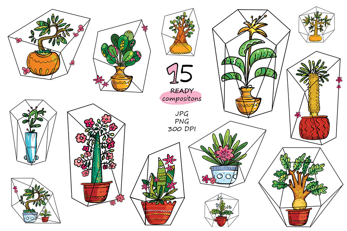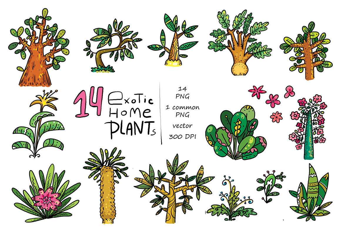 - 14 Exotic Home Plants in 14 PNG, 1 common PNG (300 DPI, 2000×2000 px, transparent background) and EPS file (vector)