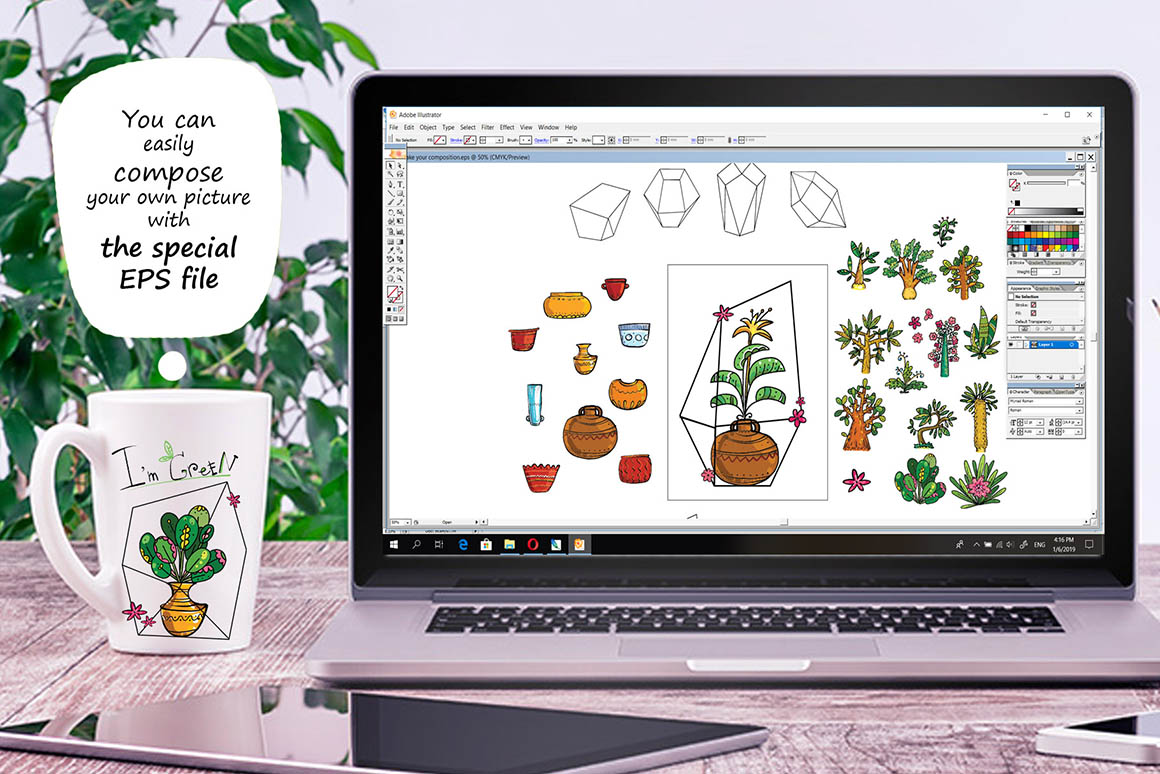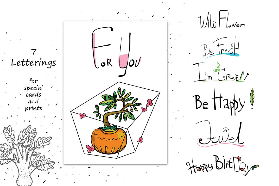 You can compose your own picture with 14 Plants, 10 Vases, 9 Frames and 7 Letterings – OR choose a ready one. I made a special EPS file for easy making, so use it:) Create warm cards, mugs, T-Shirts, tattoos, web design, clothes prints or whatever you can imagine, I would be glad to see your results! You can also use just letterings – because they are so cute)