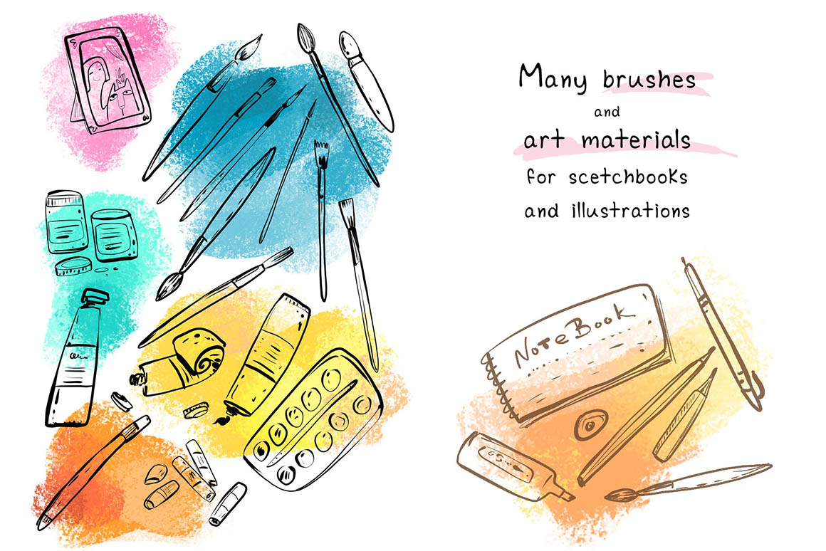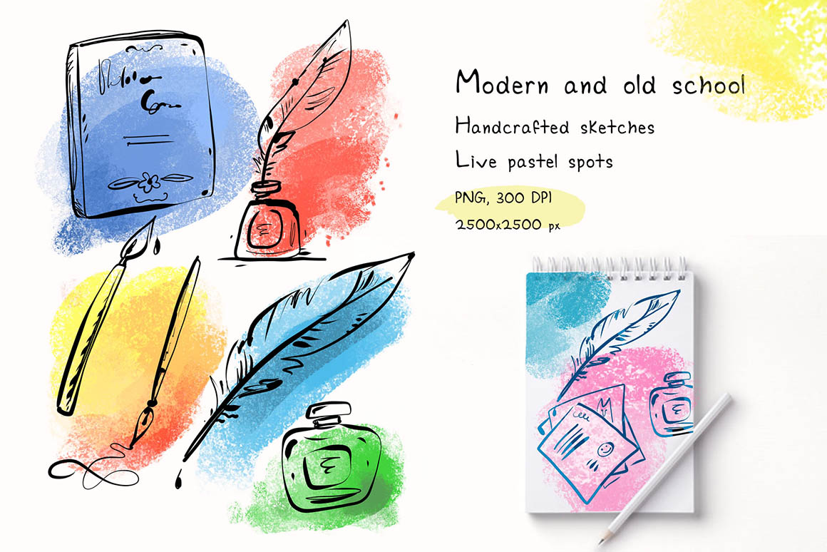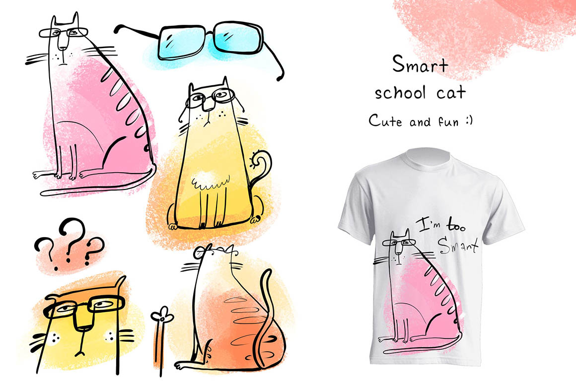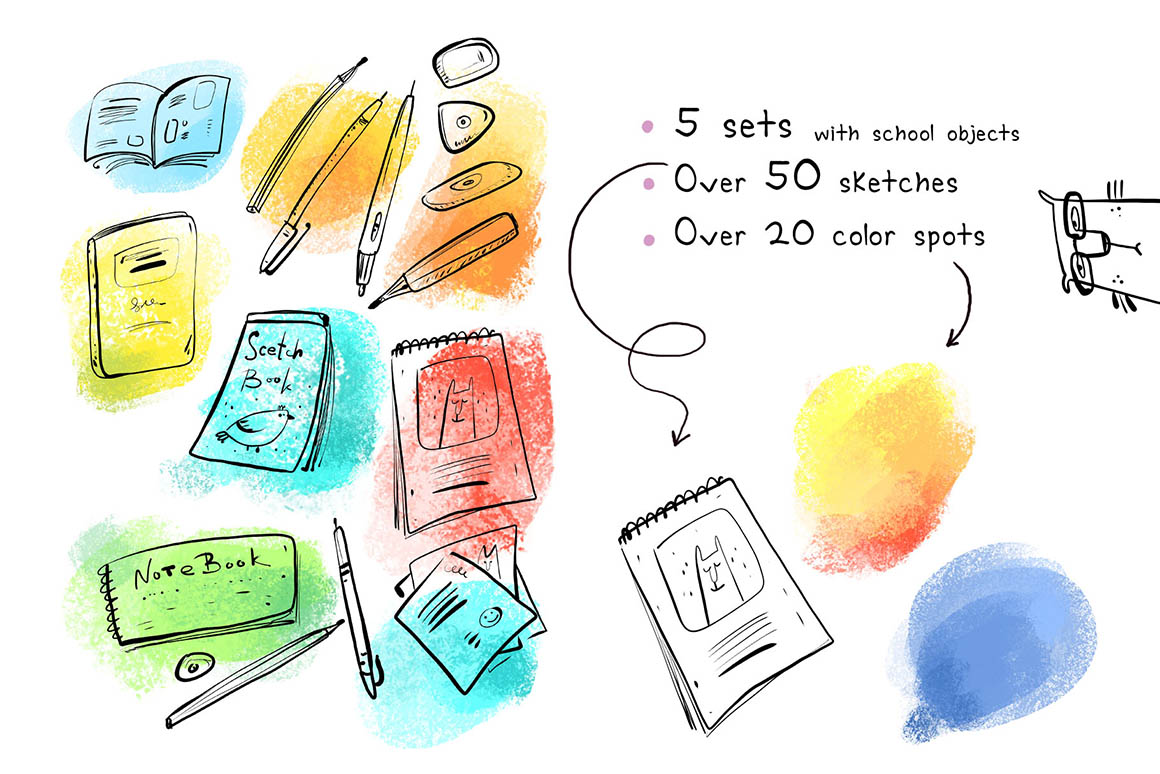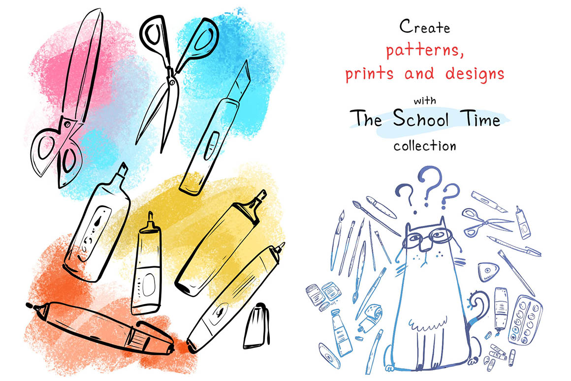 Big handcrafted set with over 50 school objects and over 20 color spots for background. Ideal for covers of sketchbooks, notebooks, illustrations, web design, children goods and prints. Cute school cat is suitable for very different goals, enjoy him everywhere!