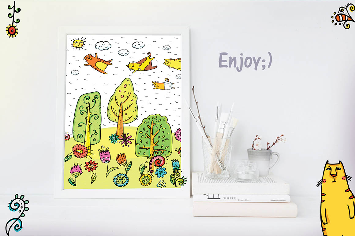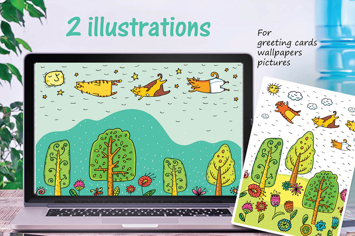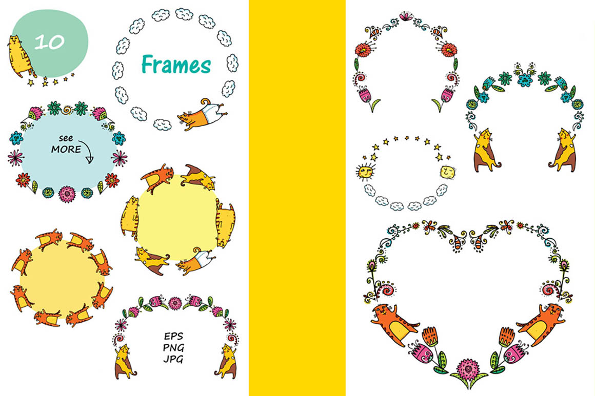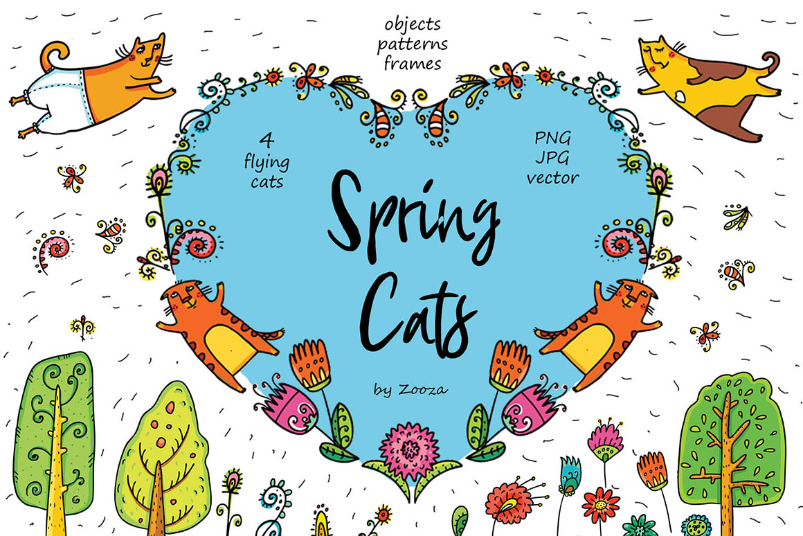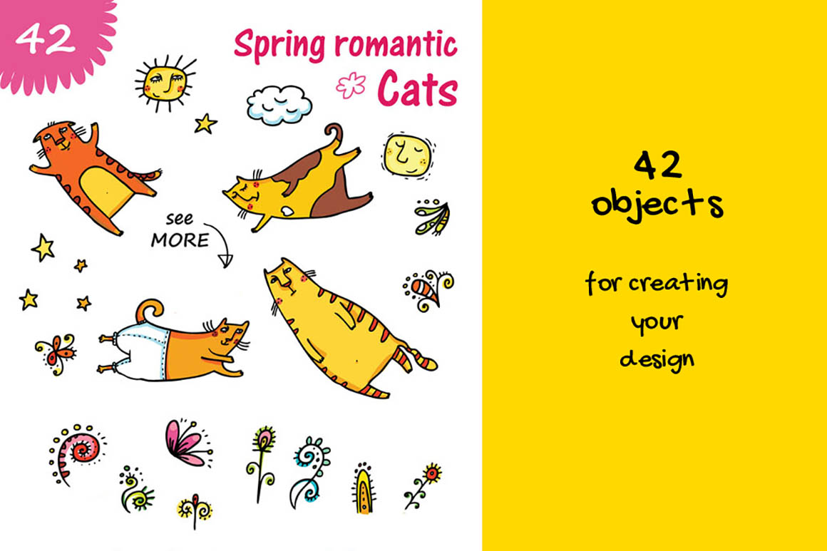 Cute spring collection of elements, patterns, frames and cards illustration. It’s all about cats, now – about Spring Romantic Cats:) Use it for bright wallpapers, cards, web design, clothes, mugs, bags and everything others. Enloy!)