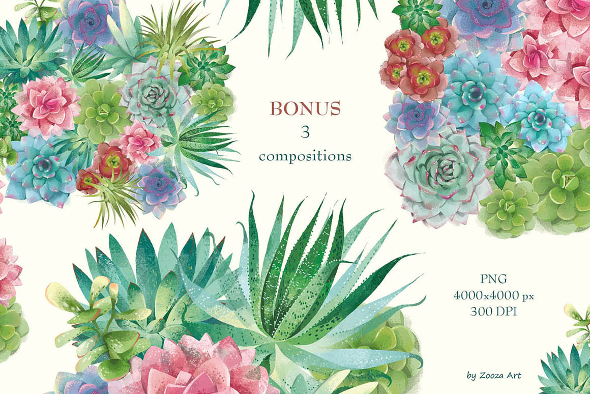 Bright handcrafted collection of pastel illustrations with succulents – 12 kinds with background and with-out. High-resolution images are ideal for beautiful cards, posters, stickers, prints, web and clothes design. Juicy seamless patterns are ready to use. Two ready cards and three ready compositions are included as a BONUS:)