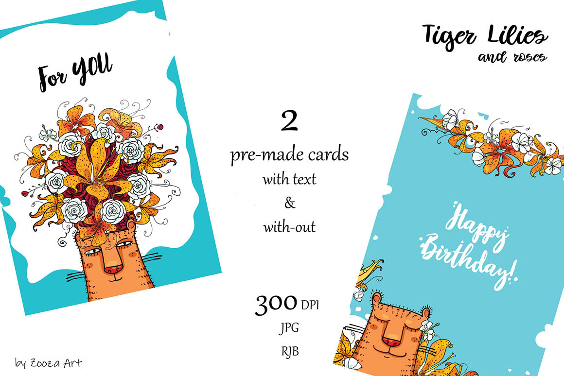 Bright floral collection with tiger lilies and cute Tiger:) White and red roses add Gothic tone and make a collection rich and playful. Use it for cards, invitations, web design, wall papers, prints and others. Two pre-made cards are in set already. Here you’ll find: