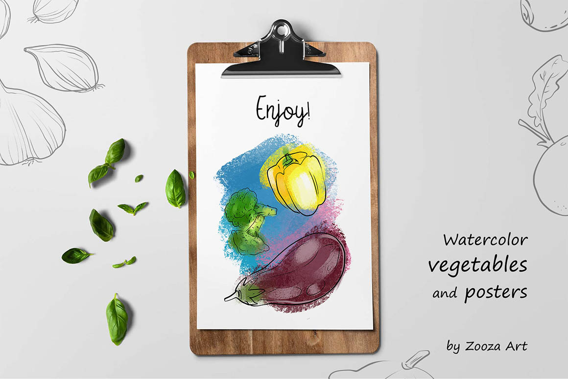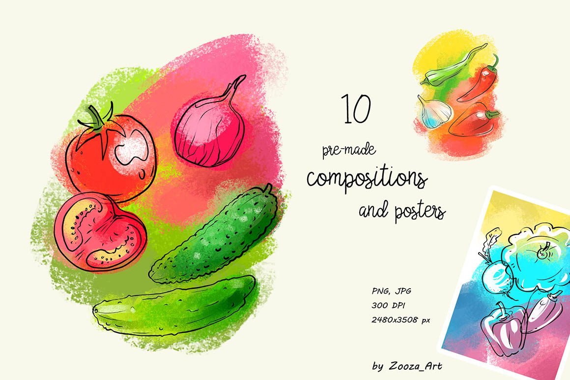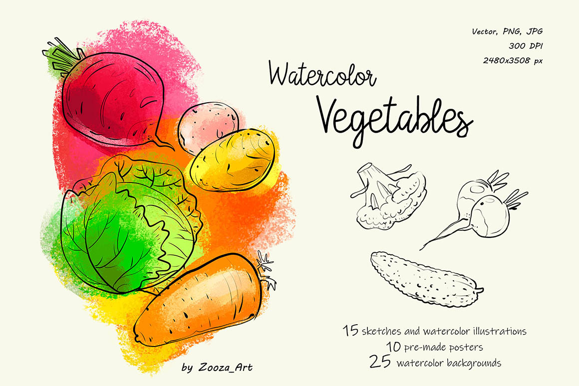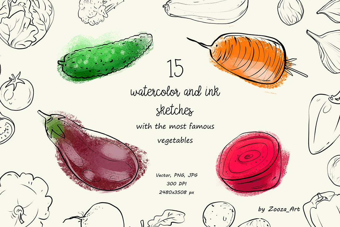 Handcrafted watercolor collection of the most famous vegetables 15 watercolor and ink sketches, about 50 vegetable images in color and black-and-white
