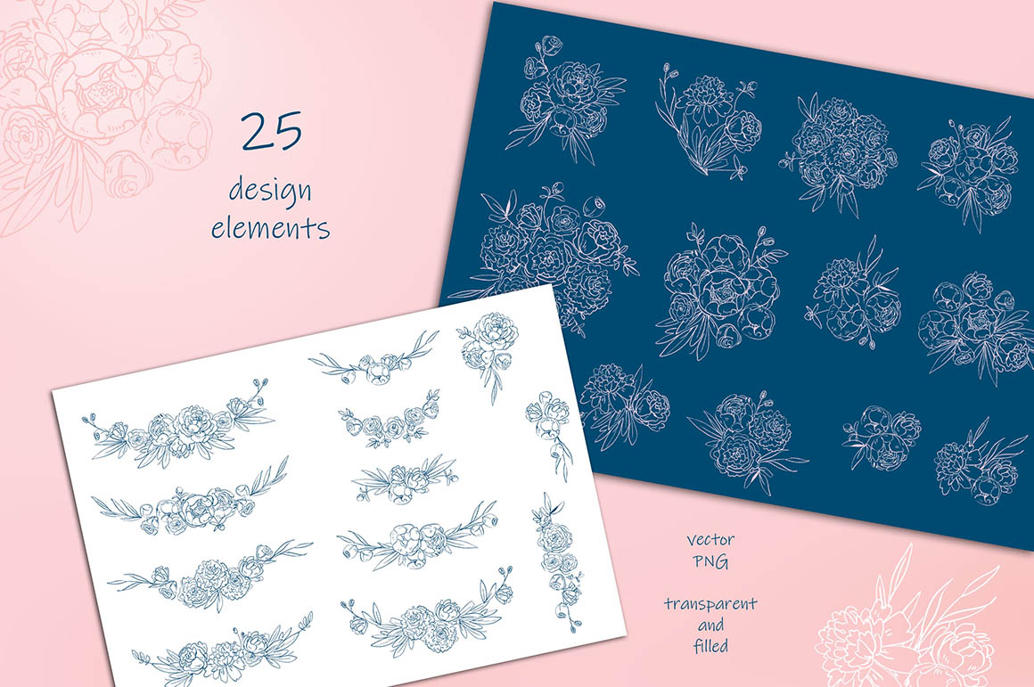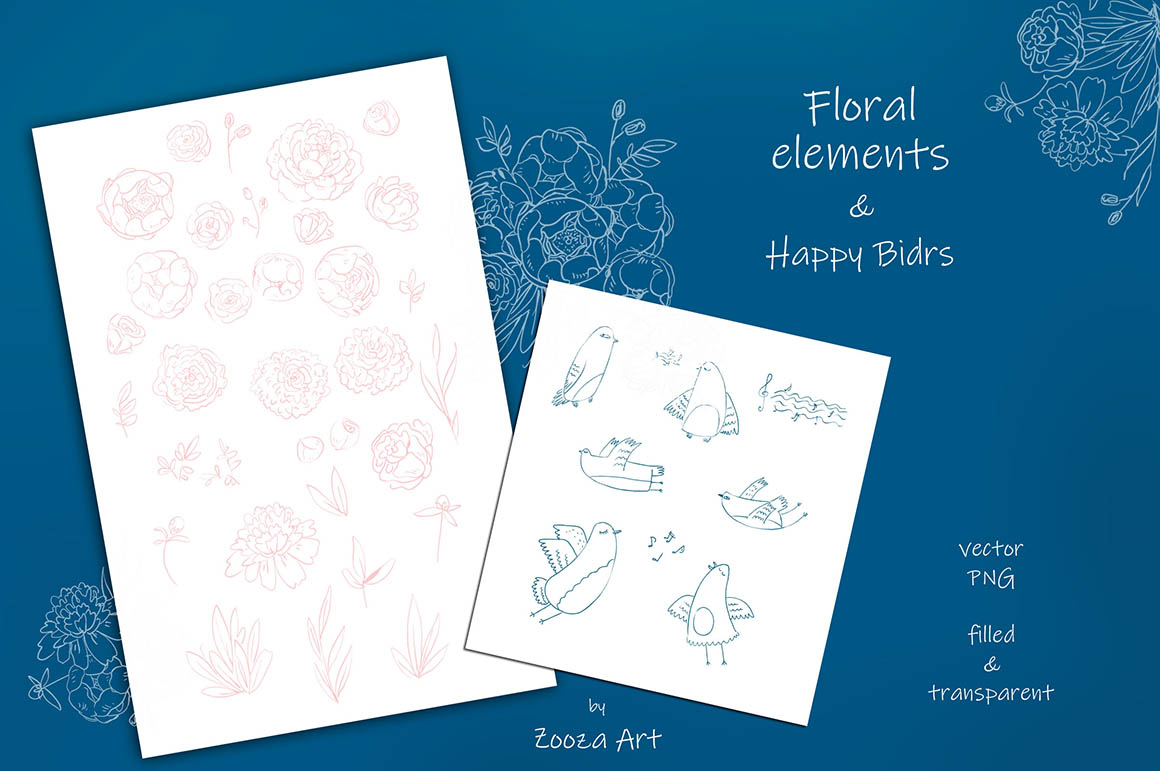 - Two collections of objects – peonies and birds (PNG, vector EPS, transparent and filled elements)