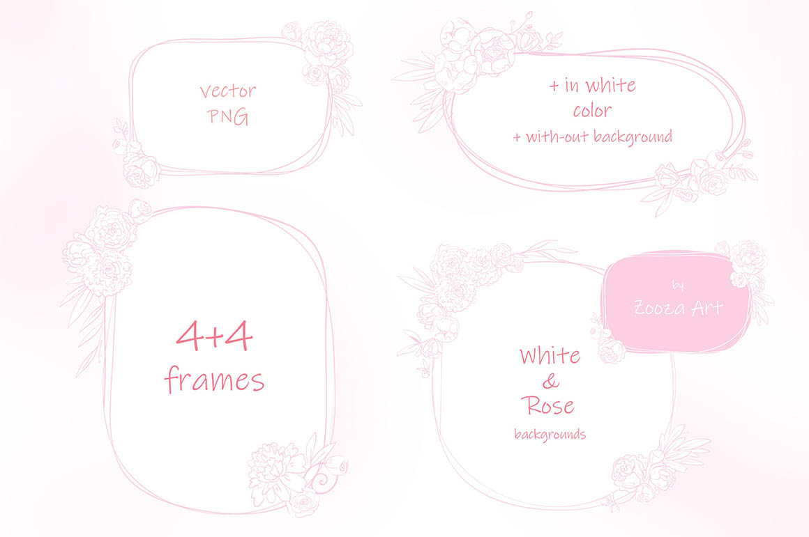 - 4+4 frames – with white and rose backgrounds, and also with-out (PNG, vector EPS, transparent and filled elements)